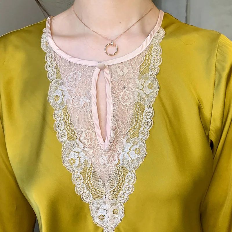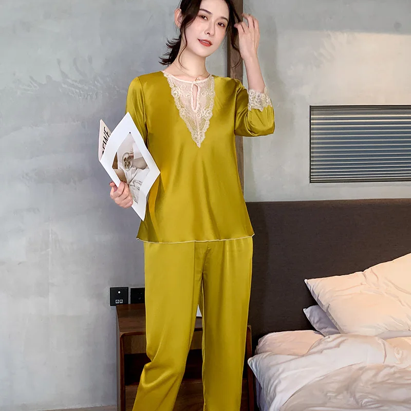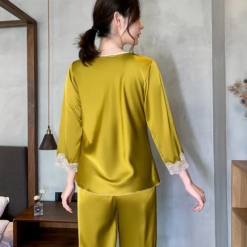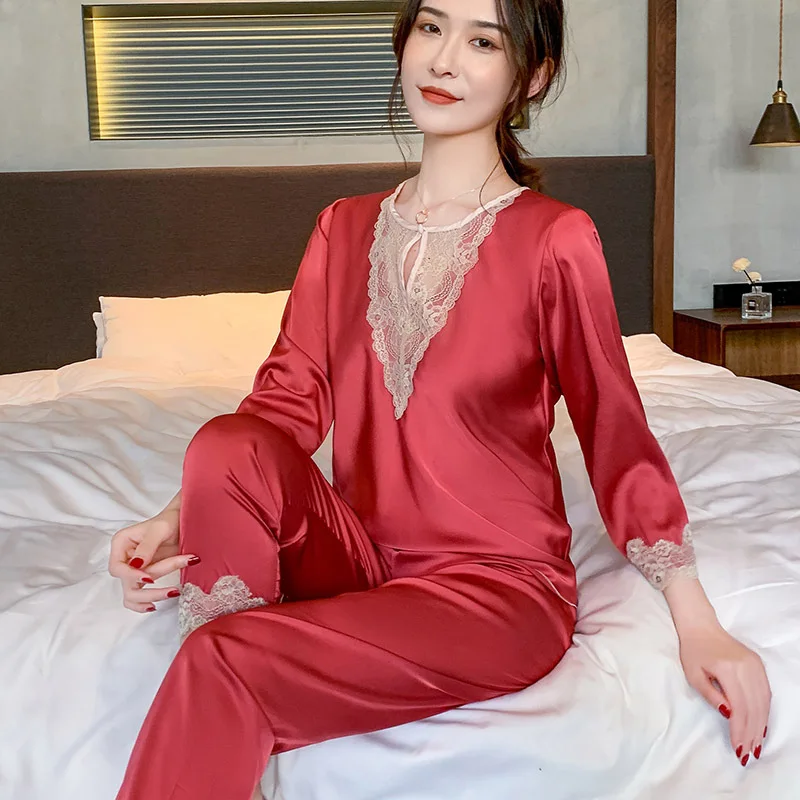 Осенне-весенние женские пижамные комплекты, пижама, одежда для сна, костюм, атласная кружевная ночная рубашка, женская пижама