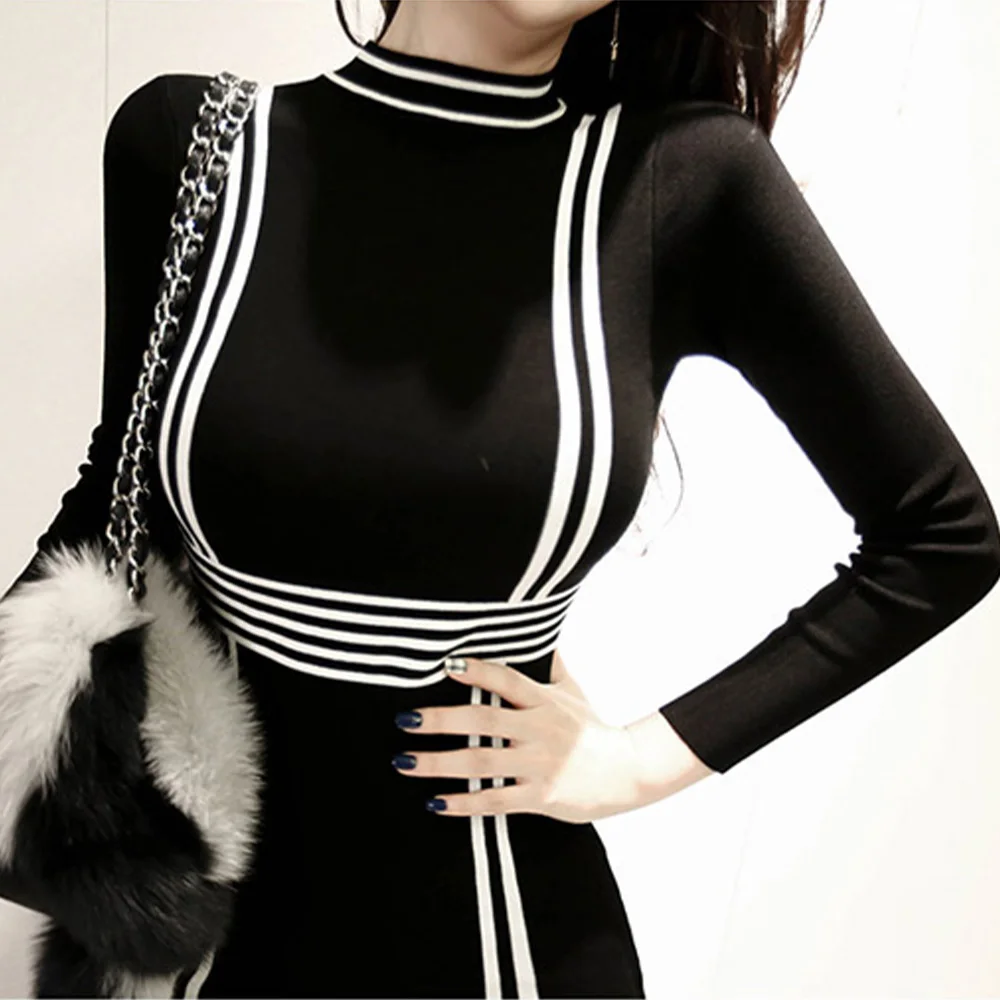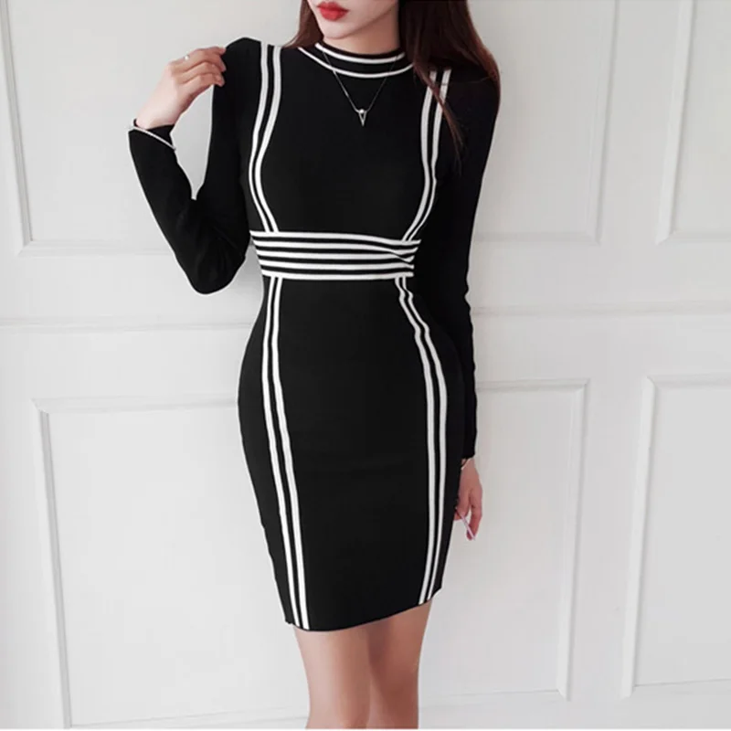 Женское трикотажное платье, жаккардовое платье-свитер с длинным рукавом и высокой талией в Корейском стиле на зиму