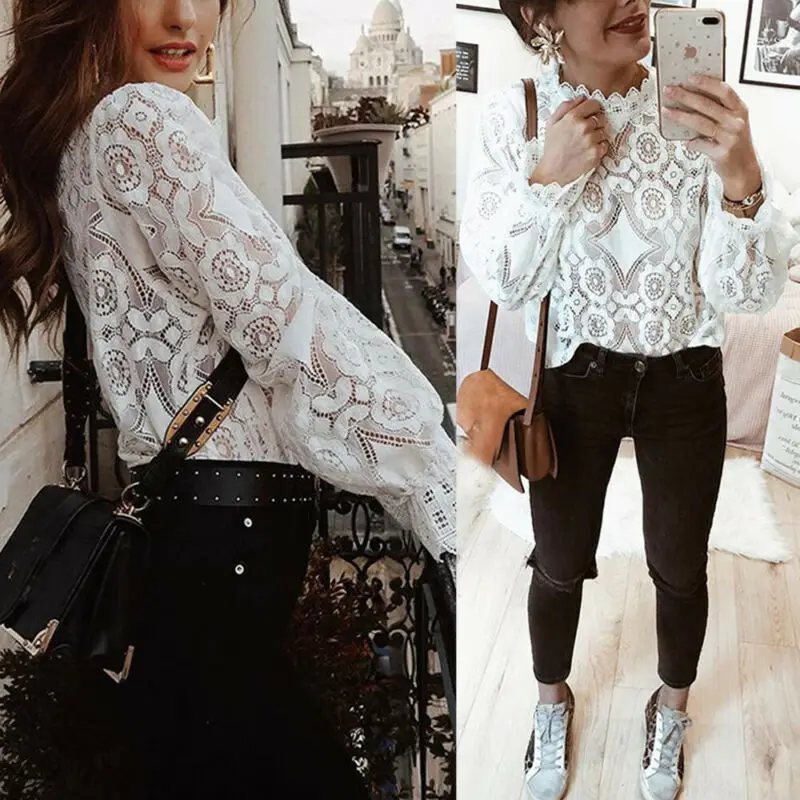 Новинка 2019, женские ажурные рубашки с длинным рукавом, элегантные летние белые кружевные рубашки с цветочным рисунком, белая футболка