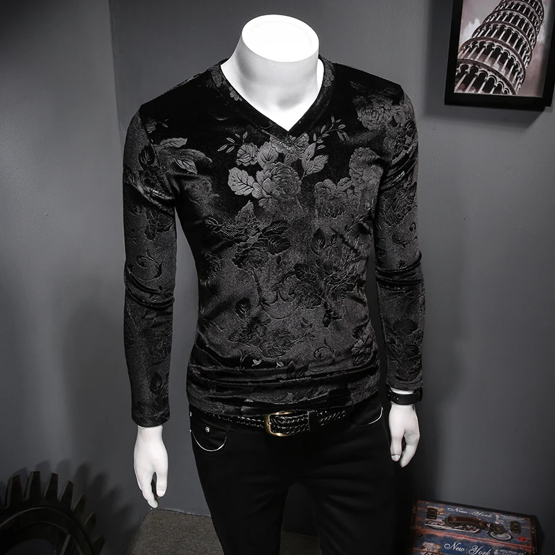Мужская приталенная футболка в стиле хип-хоп, уличная одежда с длинным рукавом, v-образным вырезом и цветочным принтом, для ночного клуба, для лета, 2019