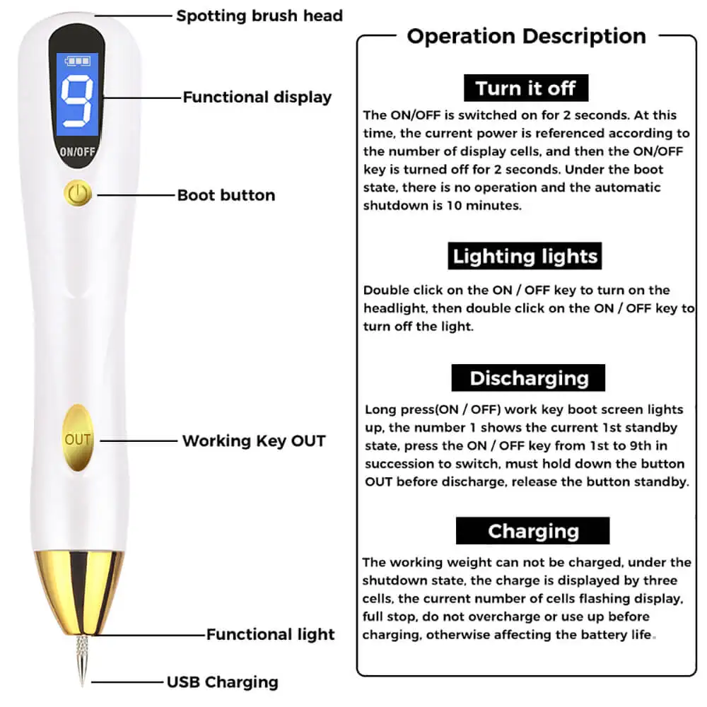 Особенности: > С технологией ионизации, она заставляет людей чувствовать себя без наличия тока во время процесса использования. Кроме того, он может безопасно удалить различные веснушки без кровотечения. > Разработан с 6-9 регулируемыми скоростями и различными выходами питания (стиль 2-6 передач, стиль 1 и 3-9 передач), применим к более широкому диапазону веснушек разного размера. > Заряжаемая модель позволяет легко снимать. Все списки: 1 ручка для удаления моль 30 x ватные тампоны 10 x тонкой иглы 2 x грубой иглы • Иглы: 1 шт. CD-диск-крышка 1 х USB кабель для зарядки Руководство пользователя (1 шт.) 1 х упаковочная коробка => С освещение лампа => 9 различных регулируемых уровней => С ЖК-дисплеем