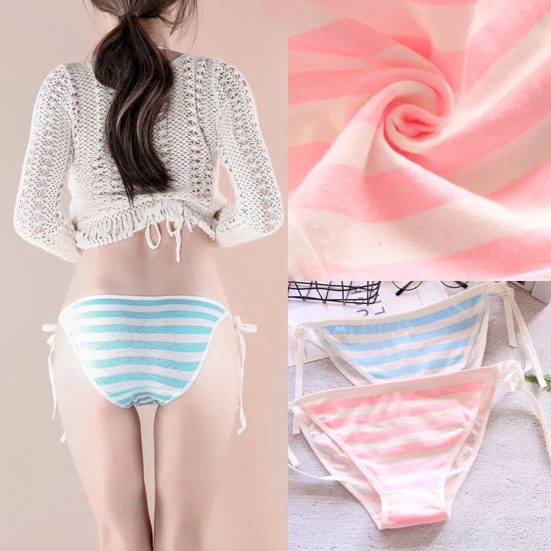 Аниме женское нижнее белье, трусики, нижнее белье, синие, розовые, белые полосатые бикини, трусы, хлопковые сексуальные трусики для косплея с боковыми бретелями, женское нижнее белье