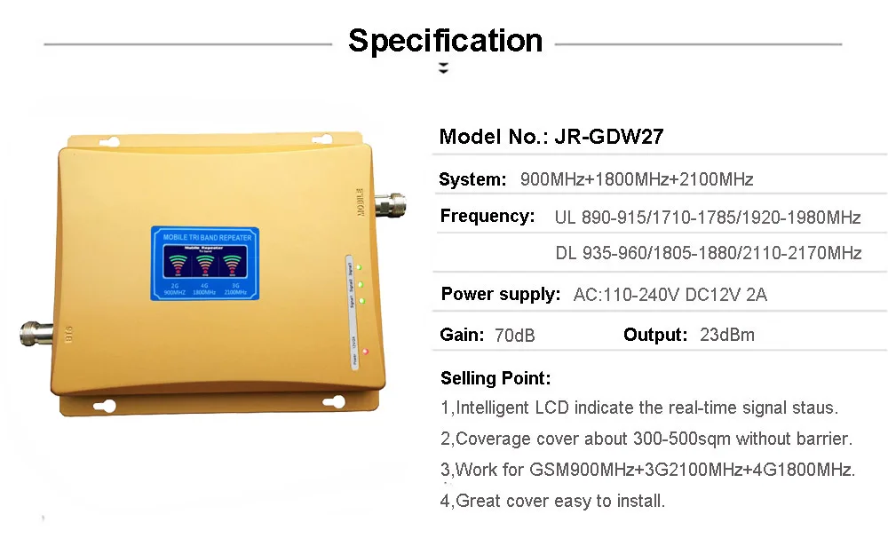 1. Усиление: 70 дБ 2. Выходная мощность: 23dBm 3. GSM 900 МГц: uplink 890-915 МГц; Downlink 935-960 МГц DCS 2600 МГц: uplink 2500-2570 МГц; Downlink 2620-2690 МГц WCDMA 2100 МГц: uplink 1920-1980 МГц; Downlink 2110-2170 МГц 4. Сопротивление: 50 Ом