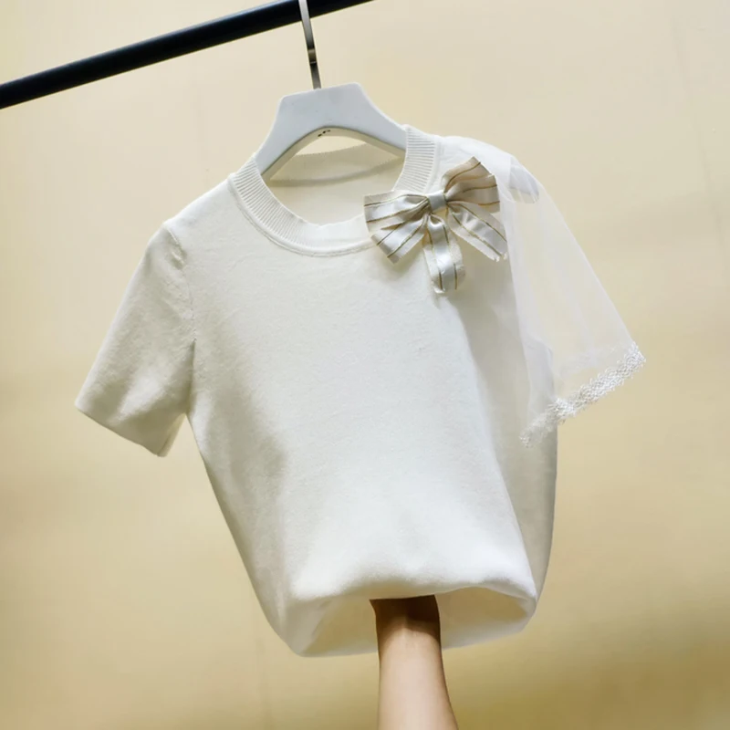 Женская трикотажная футболка с бантом, черная или белая облегающая футболка в стиле пэчворк, лето 2022