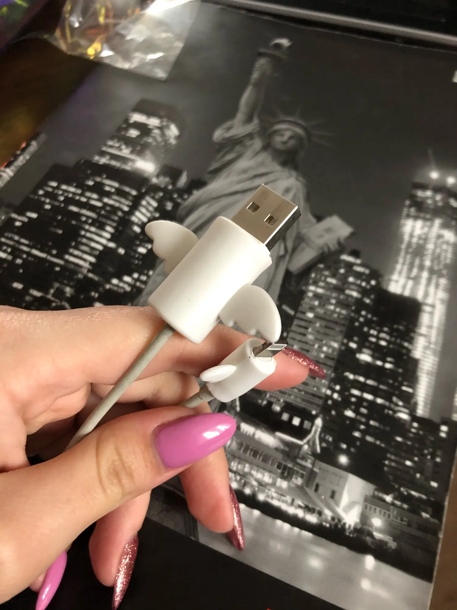 как на фото. жаль не подошёл на мой проводподарю подруге, у которой айфон