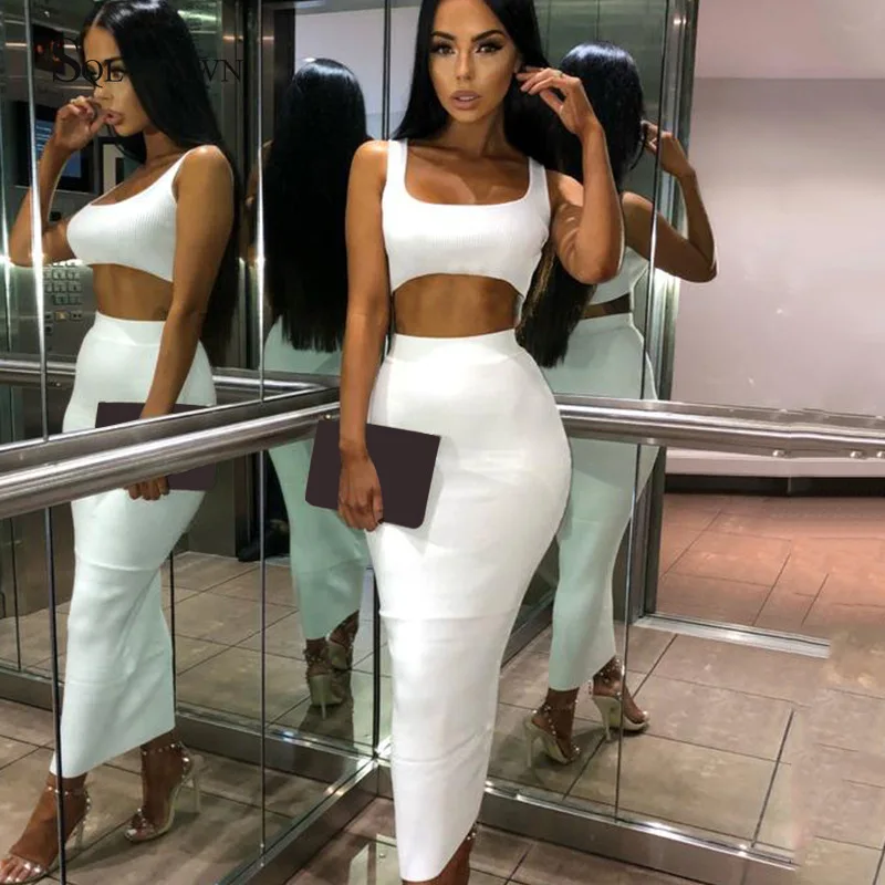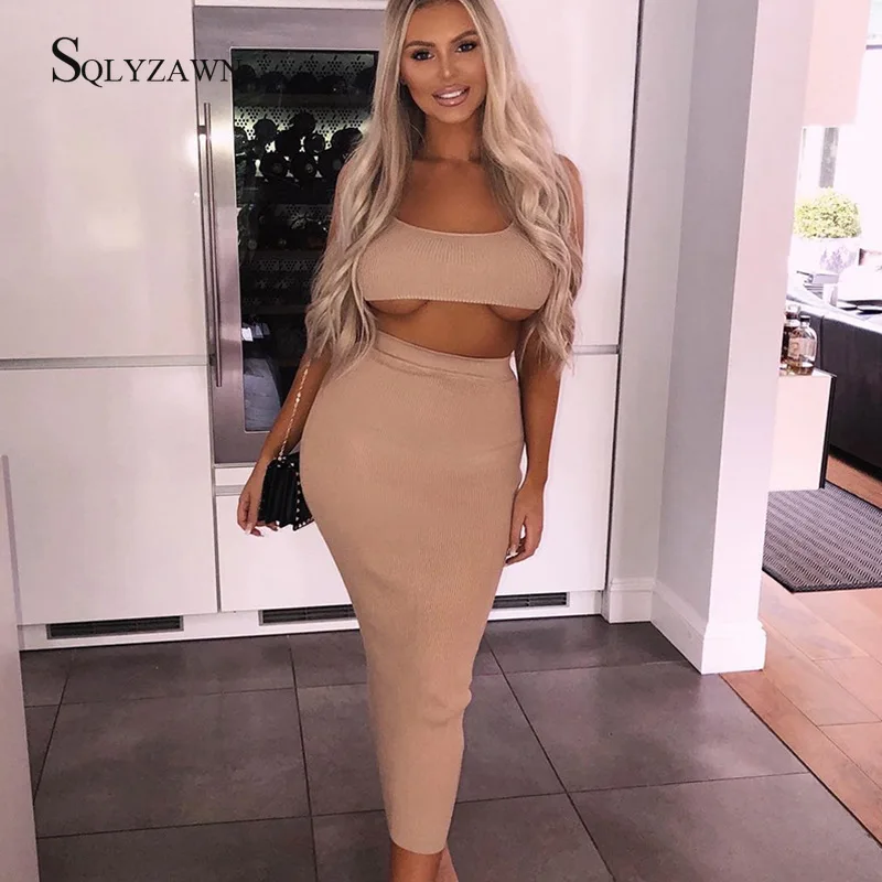 Женский трикотажный комплект из двух предметов, неоновый комплект в рубчик, короткий топ без рукавов, праздничная одежда для вечеринки, зима пикантная юбка средней длины, 2019