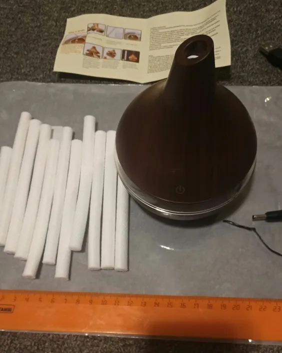Посылку привёз домой курьер. Коробка была целая. Продавец положил в подарок маску для сна, большое спасибо! В комплекте шли 10 хлопковых фильтров, USB провод. Диффузор замечательный, меняет цвета, можно использовать, как ночник. Нужно следить за достаточным количеством воды, сам не отключается.