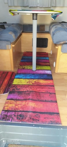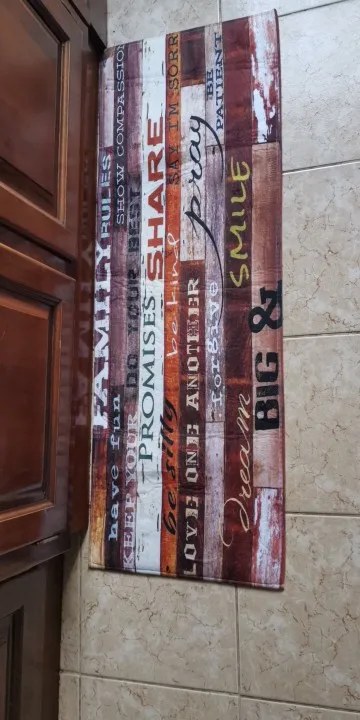 Коврик как коврик. Конечно, на снимке - лучше. Прорезиненный слегка, чтоб не скользить. Большего не скажу, потому что и не разглядела ничего особенного... Также и плохого не могу сказать. Мне понравился рисунок, но на фотке это под кусок ламината, а на деле - ...просто коврик....