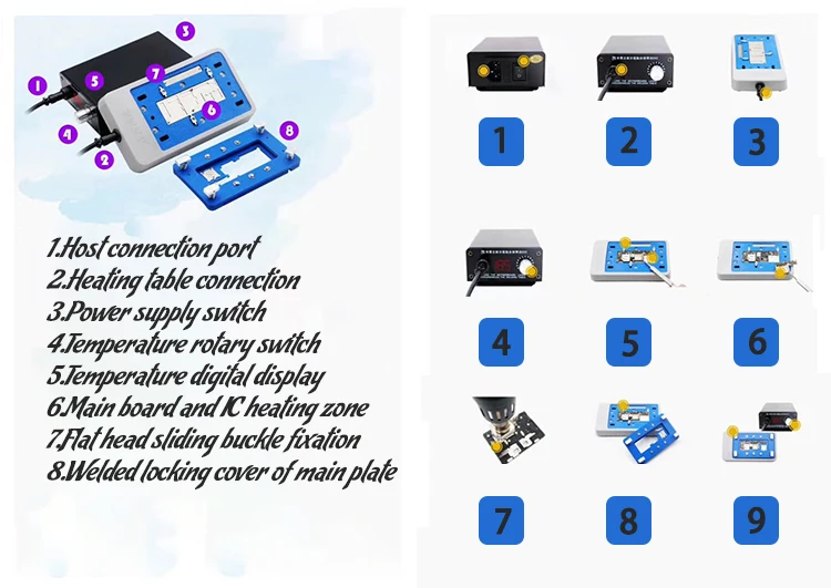 1. Подключите шнур питания, включите выключатель питания (Универсальное напряжение 110 В и 220 В) 2. Подключите линию переключателя к термостату 3. Подключите линию передачи к нагревательному столу 4. Отрегулируйте регулятор температуры до 185 градусов. (Температура варьируется в зависимости от сезона и окружающей среды) 5. Время нагрева составляет около 3 минут, а Подогрев равномерный. (разные сезоны и среды занимают разное время) 6. Демонтируйте место олова после его расплавления 7. Установка олова после ремонта материнской платы 8. Поместите материнскую плату в Процесс демонтажа и пайки платформы и блокировки 9. Зажмите на крышке, отрегулируйте температуру до 185 градусов, нагрейте в течение 3 минут, затем закройте и выньте