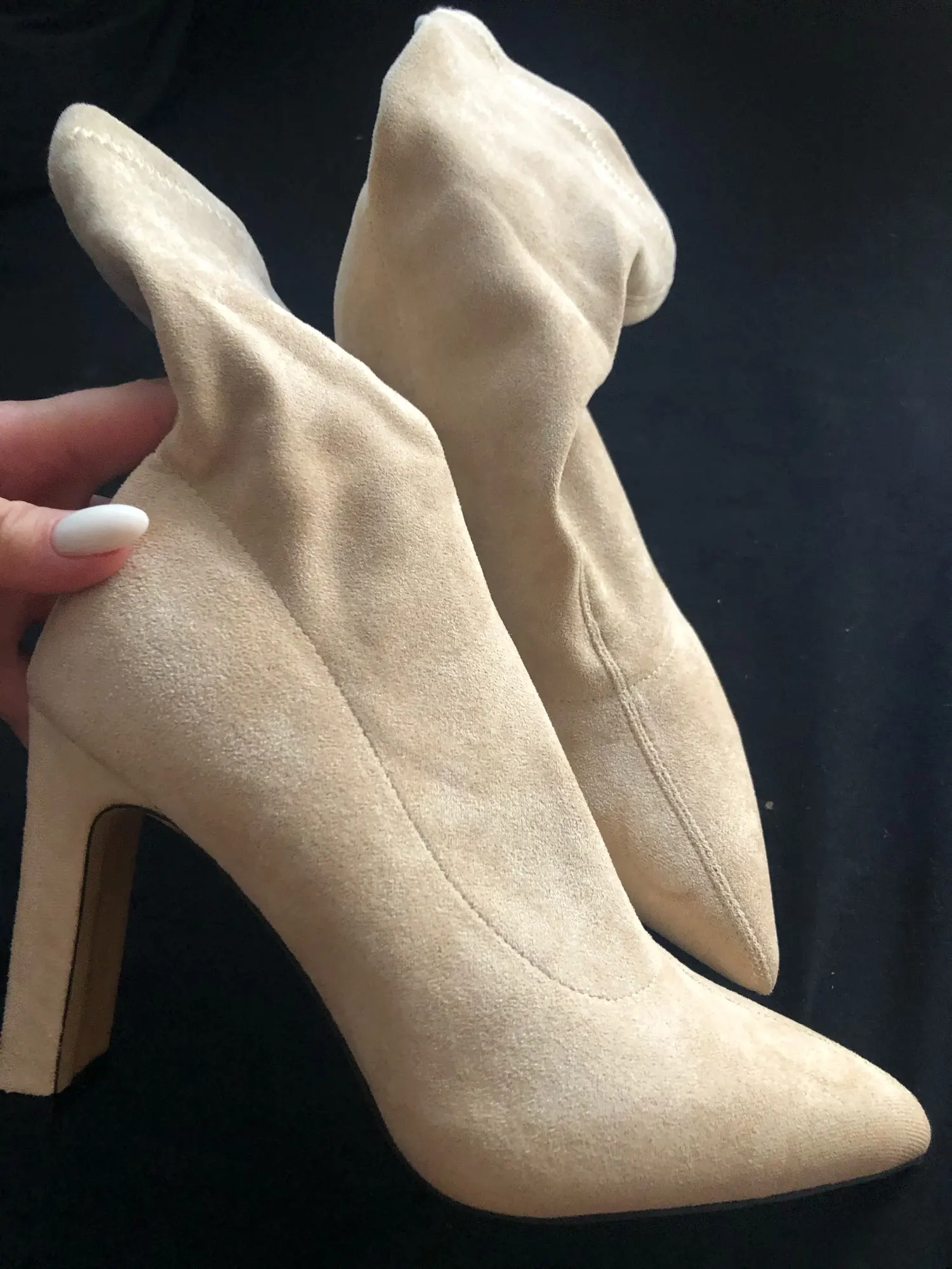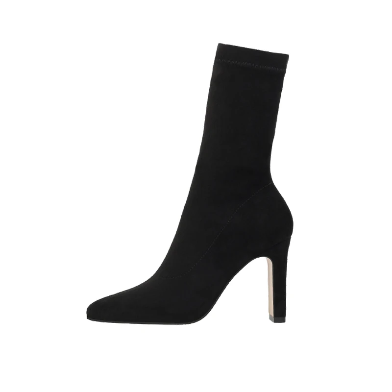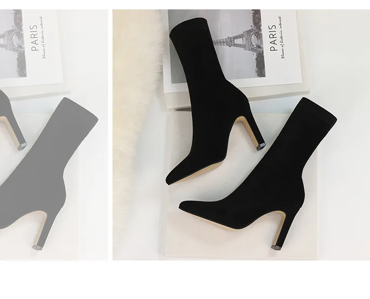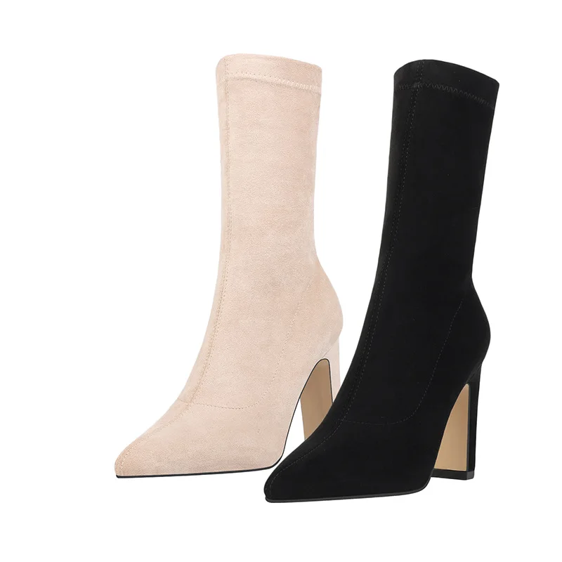 Сапоги на высоком каблуке размера плюс; женская обувь из флока; коллекция 2021 года; пикантные вечерние ботильоны на толстом каблуке; женские зимние ботинки с острым носком