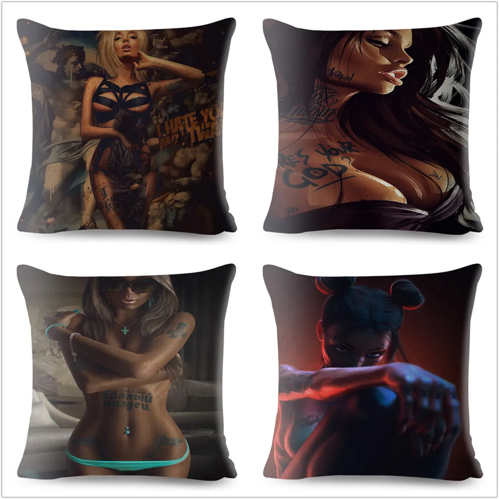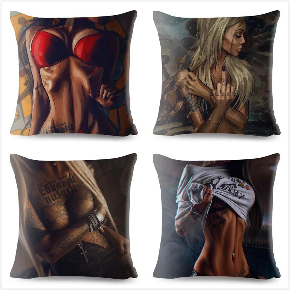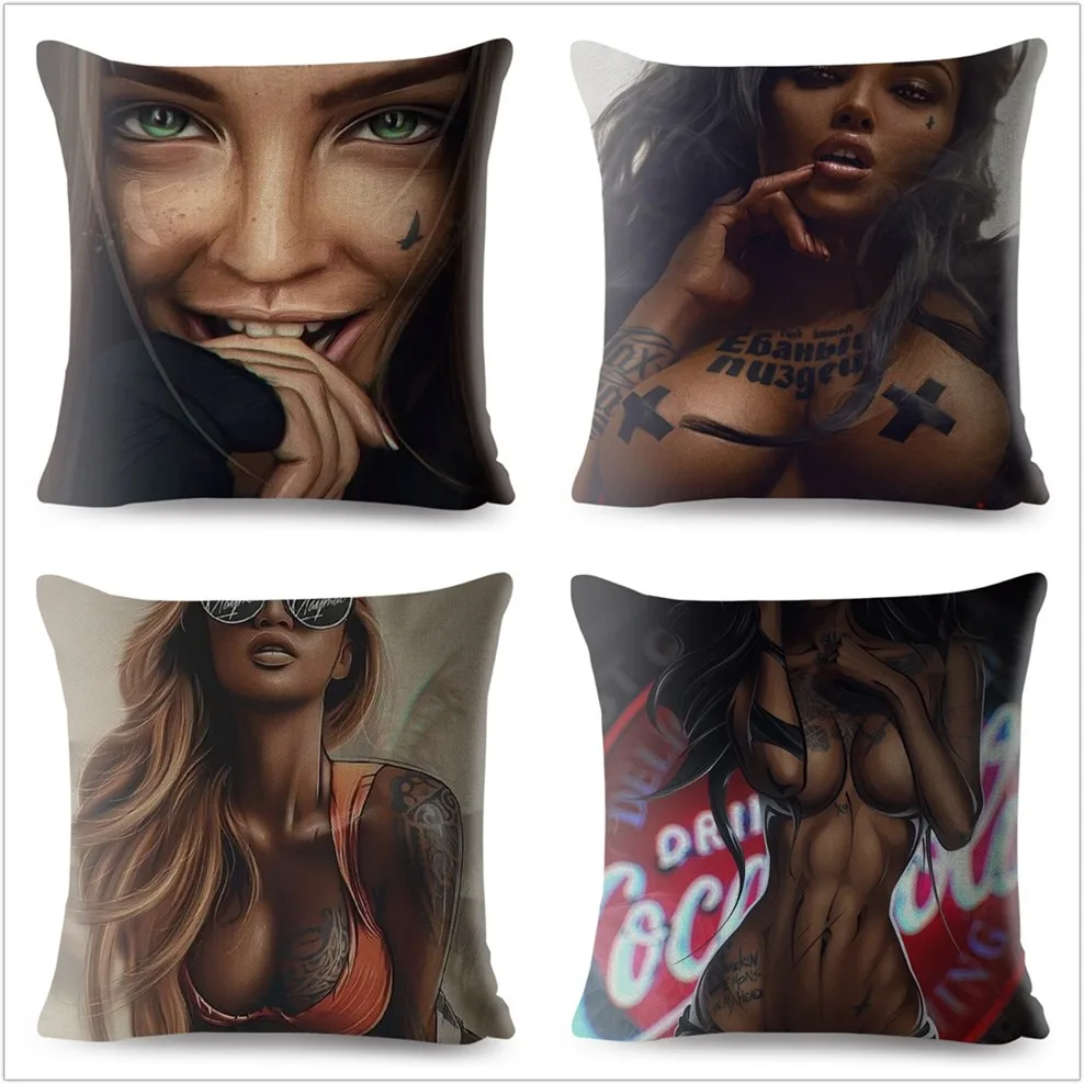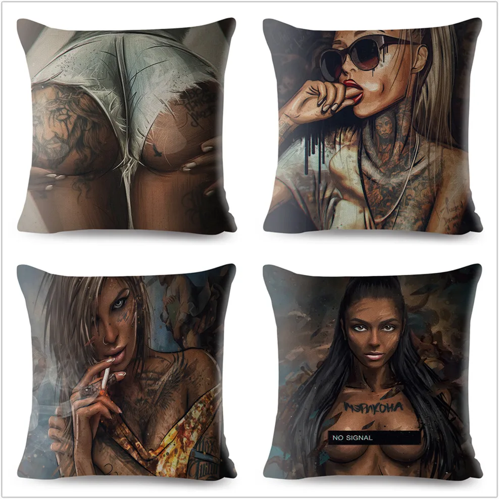 Изготовленный на заказ сексуальная девушка с татуировкой Для женщин чехол для подушки с принтом льняные наволочки 45*45 квадратная Подушка Чехол для дивана наволочка для домашнего декора чехол