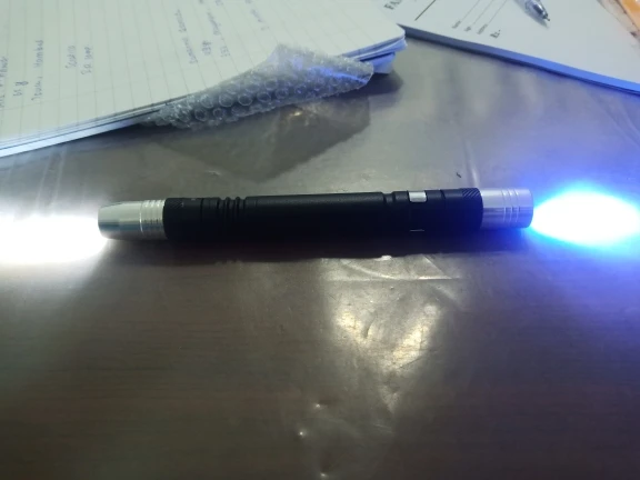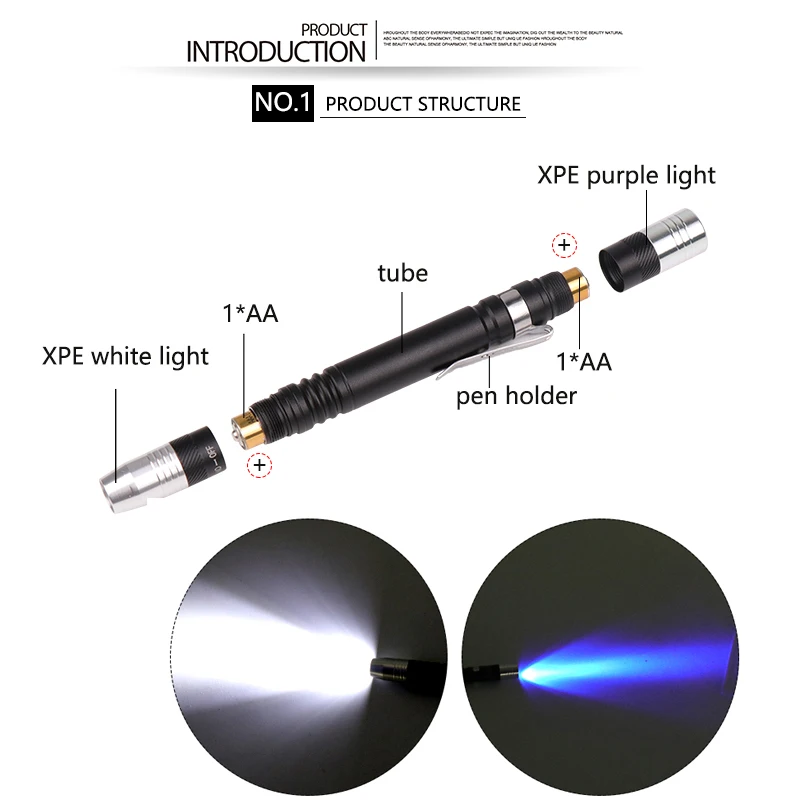 Модель: 1913B Светильник: XPE белый + XPE 395 фиолетовый Размеры: 15*1,4*1 см Вес: 28 г Материал: алюминиевый сплав Аккумулятор: 2 * AAA (не входит в комплект) Переключатель: поворотный переключатель Положение шестерни: 1 файл