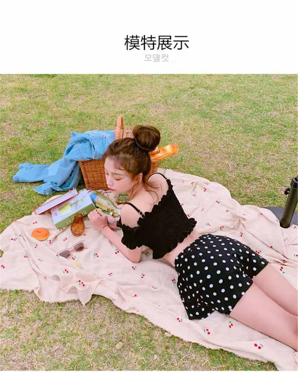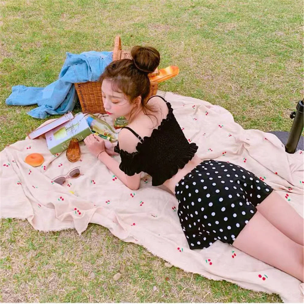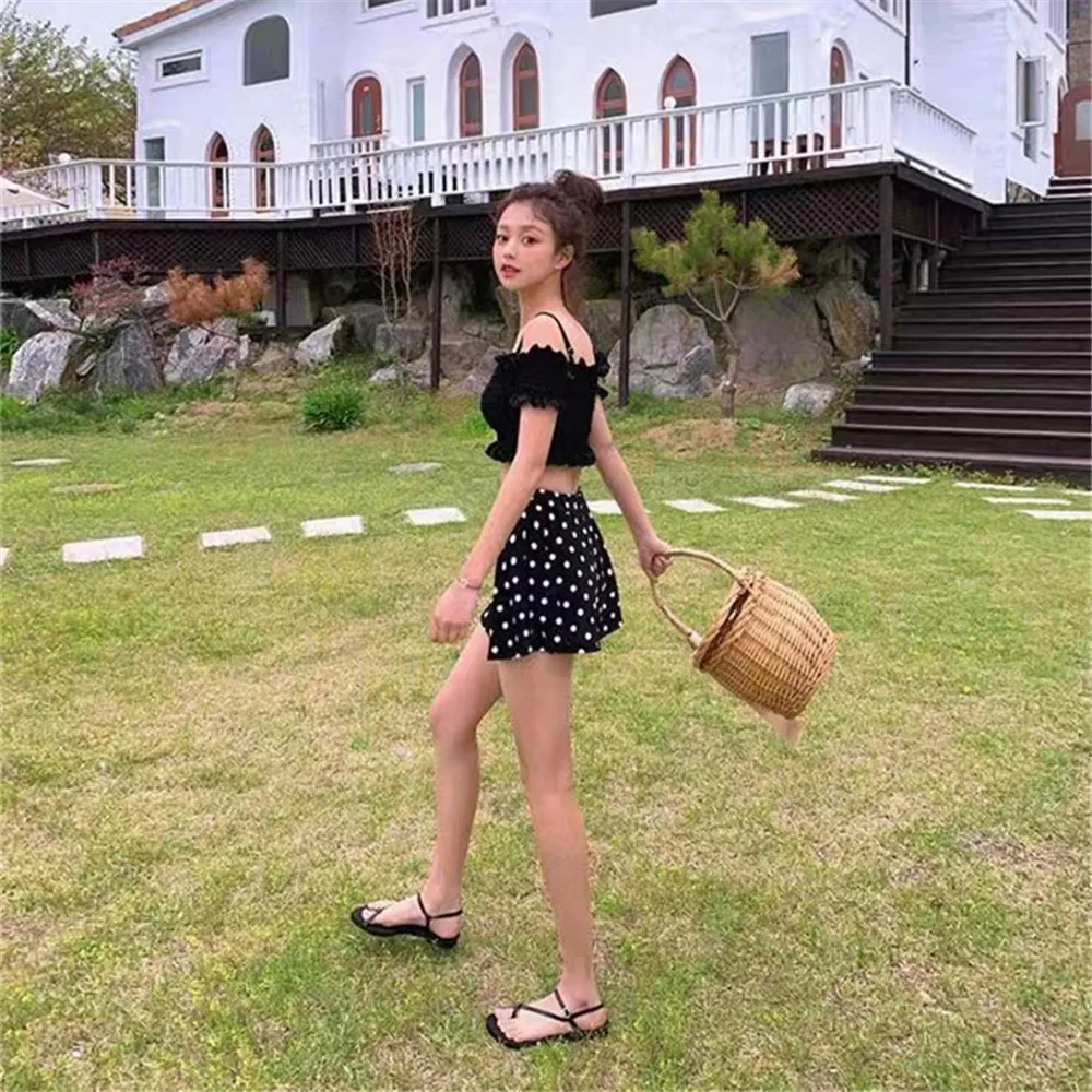 Купальник женский в горошек, пикантный бикини с открытыми плечами, с высокой талией, с чашками пуш-ап, с оборками, пляжный костюм для плавания в Корейском стиле