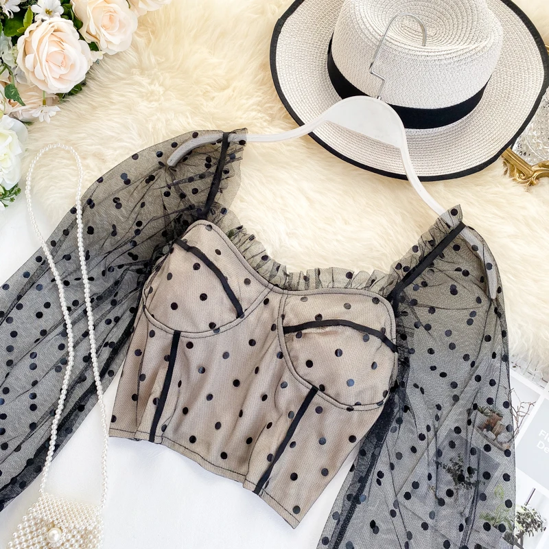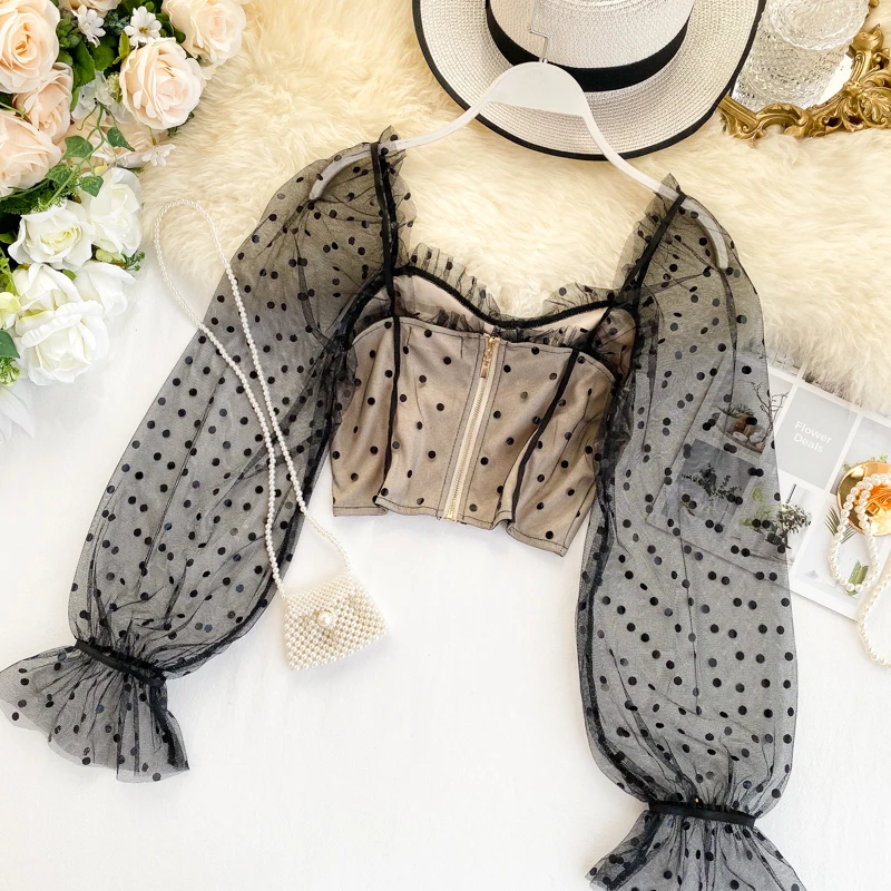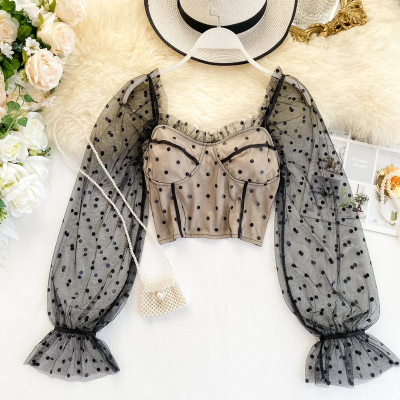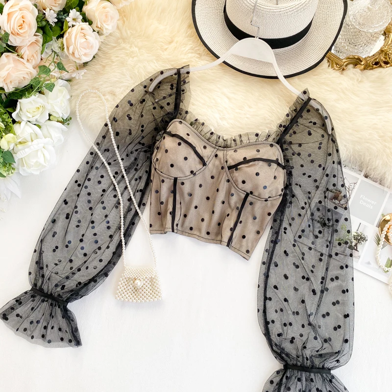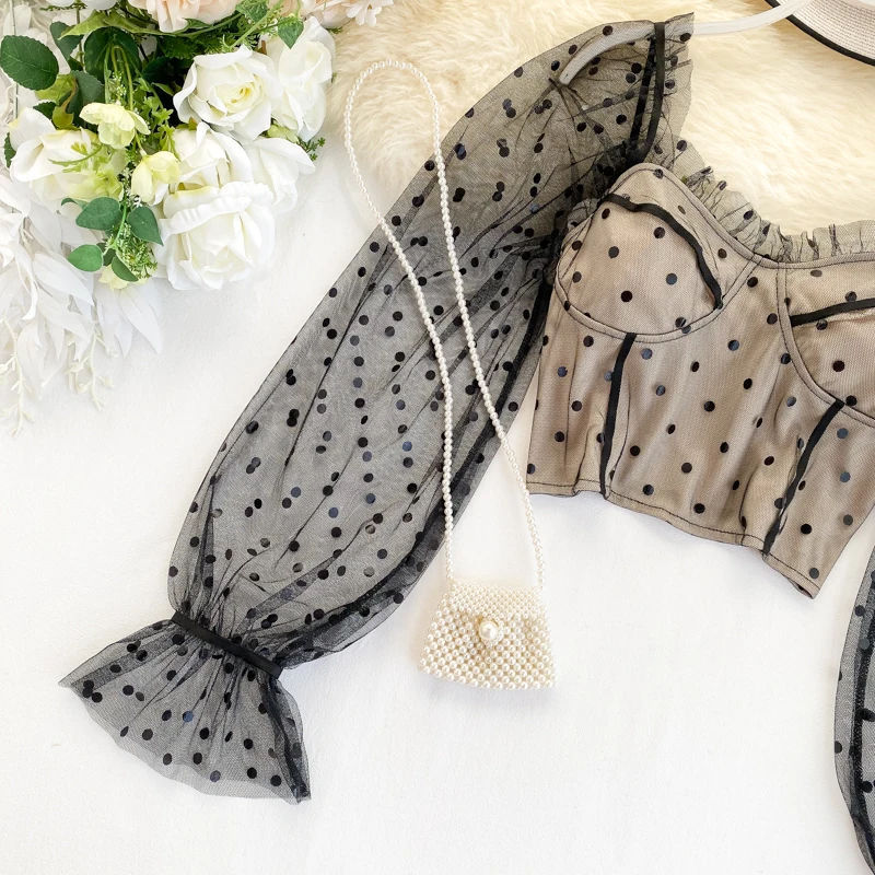 Шикарная сетчатая блузка с длинным рукавом, Женская пикантная блузка в горошек с вырезом лодочкой, Короткие топы, блузки, элегантные женские блузки K208