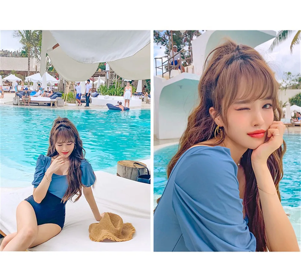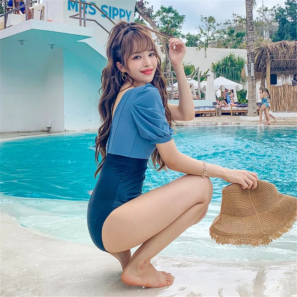 Слитный купальник в Корейском стиле, Женский однотонный купальник, монокини с коротким рукавом, купальник с эффектом пуш-ап, трикини с открытой спиной, синий купальный костюм