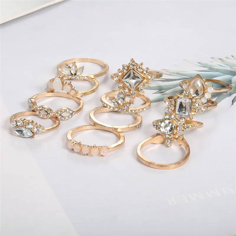 Классическое кольцо NEWBUY 12 шт.компл., комплект женских колец с золотыми кристаллами, геометрическими драгоценными камнями и короной, очаровательные ювелирные украшения для вечеринки и свадьбы