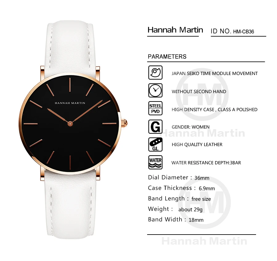 Модель: HM-CH36LeatherБренд:Ханна МартинМеханизм: японский часовой модуль SeikoЧехол: сплавДиаметр циферблата: 36 ммТолщина циферблата: 6,9 ммДлина ремешка: 240 ммШирина полосы пропускания: 18 ммВес: около 29 гВодонепроницаемость: 3 АТМСтекло: устойчивое к царапинам минеральное стекло