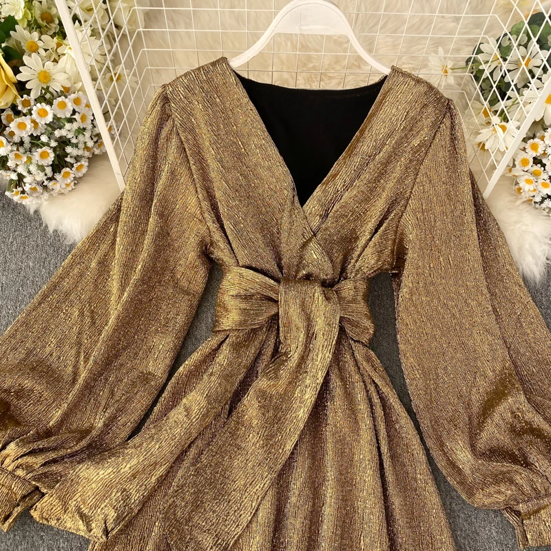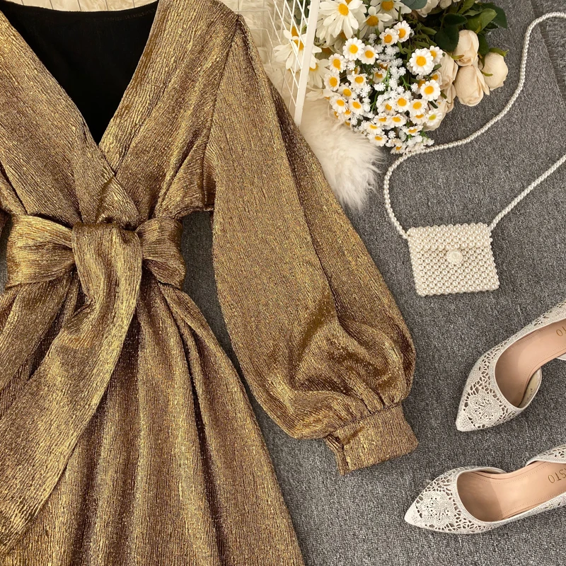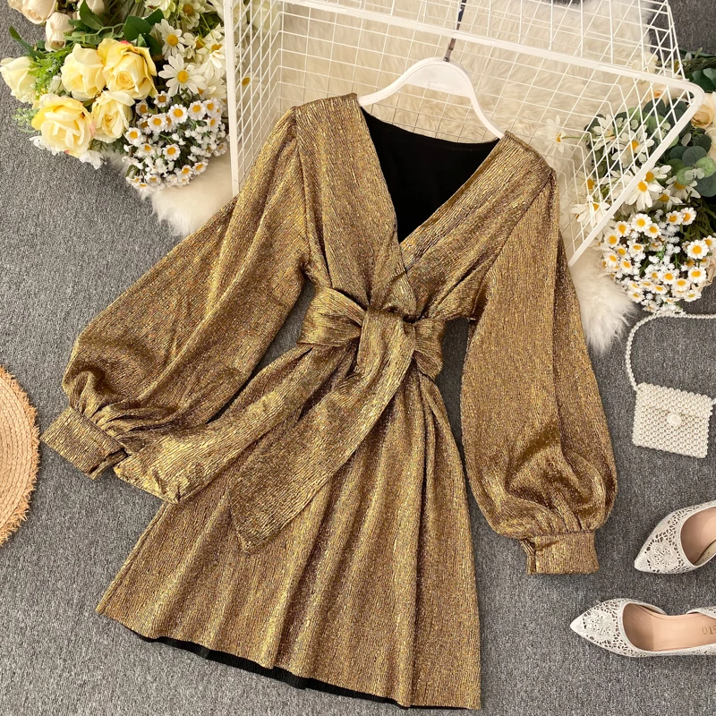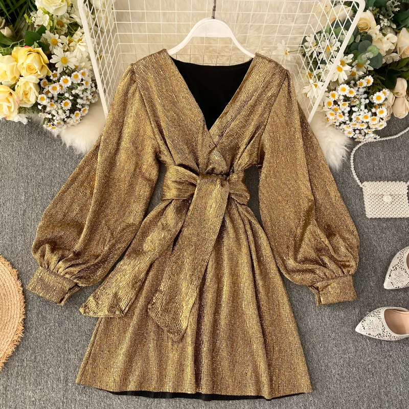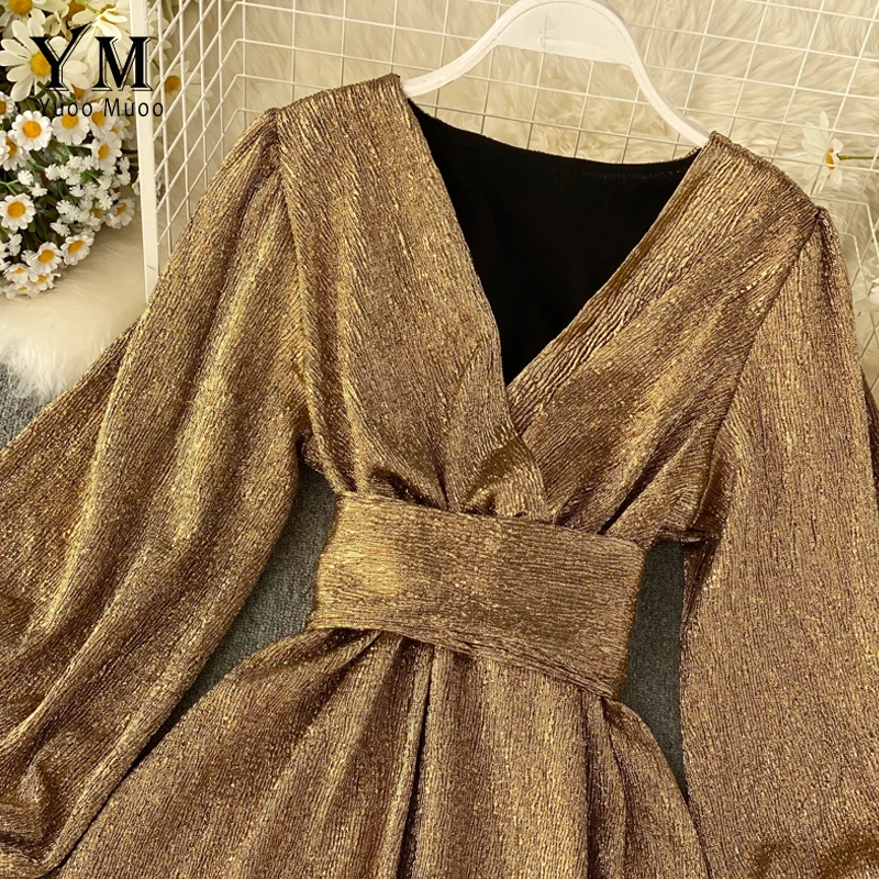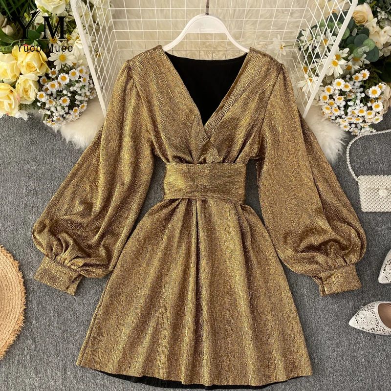 Женское Короткое платье YuooMuoo, золотистое блестящее Бандажное платье с рукавами-фонариками и v-образным вырезом, вечерние платья, 2019
