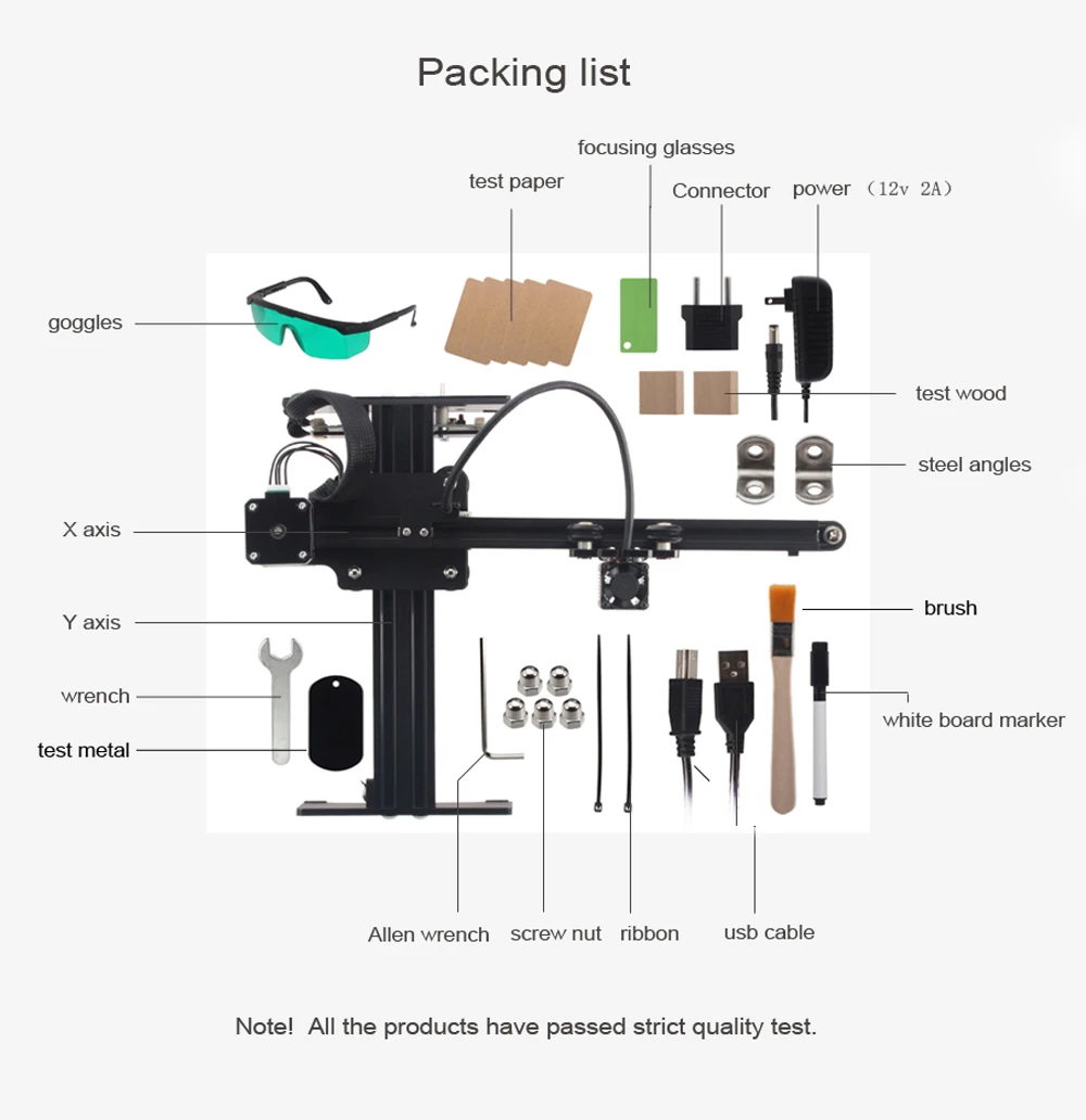 Посылка включает в себя: 1 * гравировальный станок; 1 * защитные очки; 1 * usb-кабель; 1 * Адаптер питания; 1 * гаечный ключ; 1 * знак доски; 2 * деревянный блок; 5 * бумага;