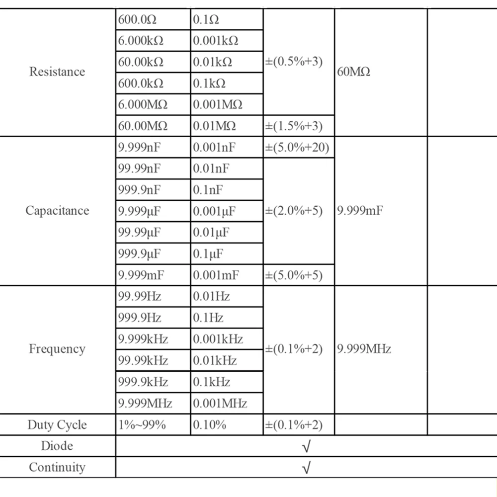 Диапазон измерения сопротивления600Ω/6kΩ/60kΩ/600kΩ/6MΩ/60MΩ