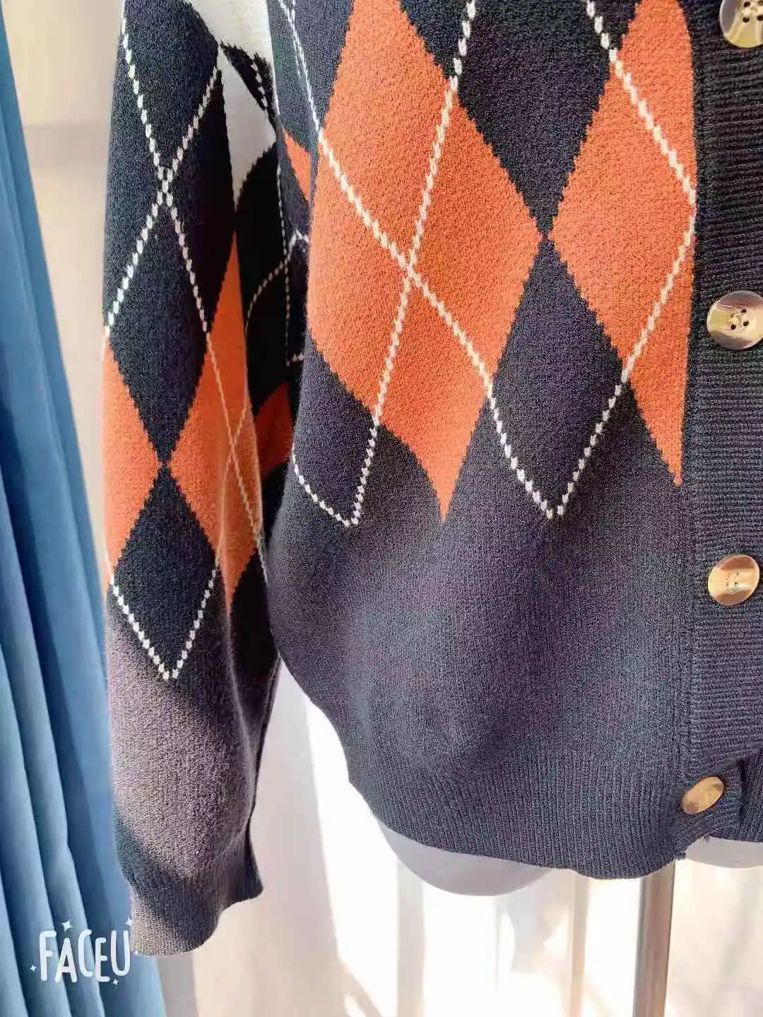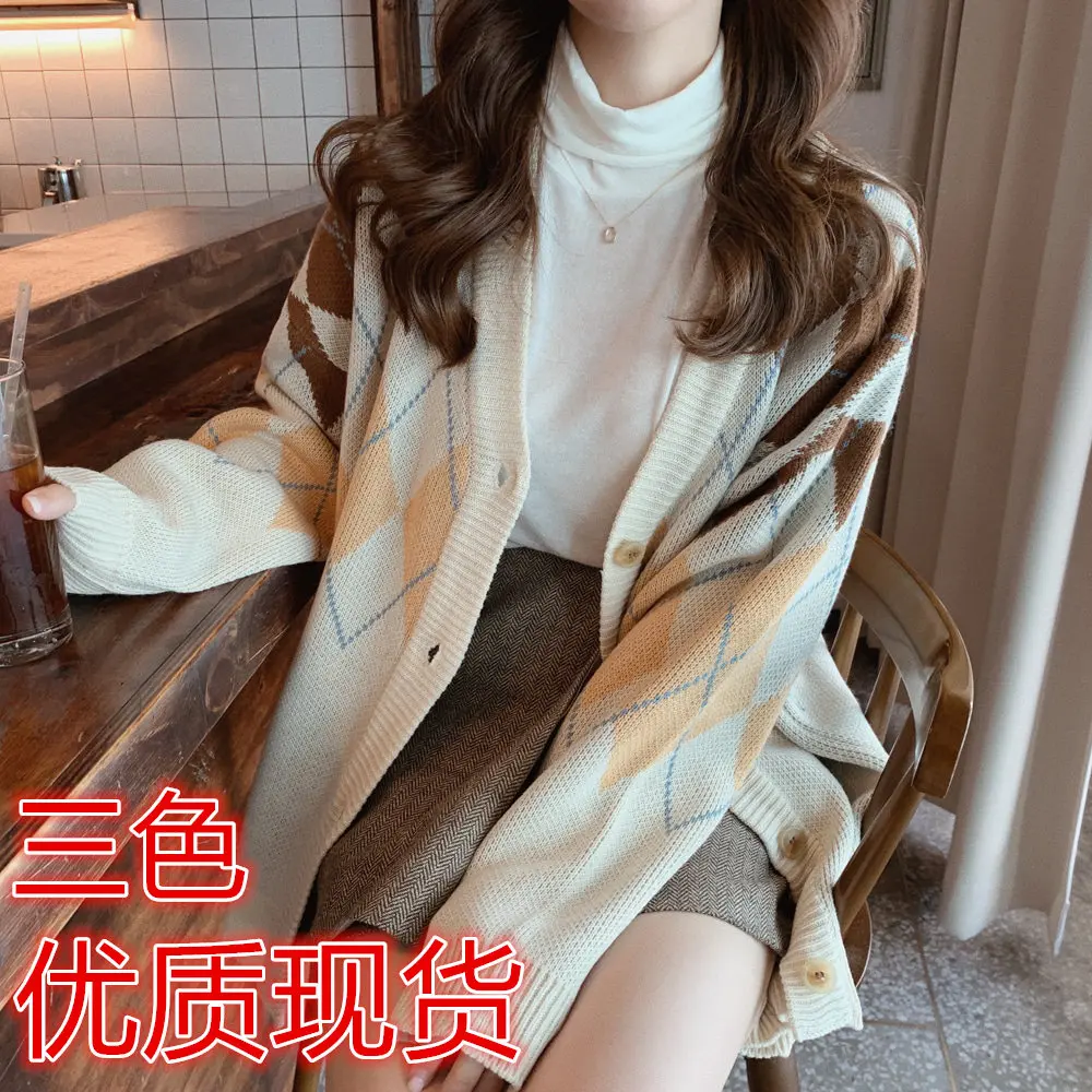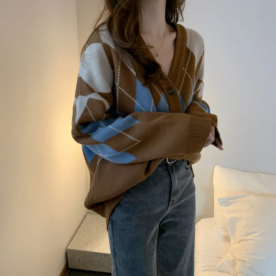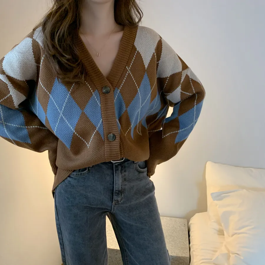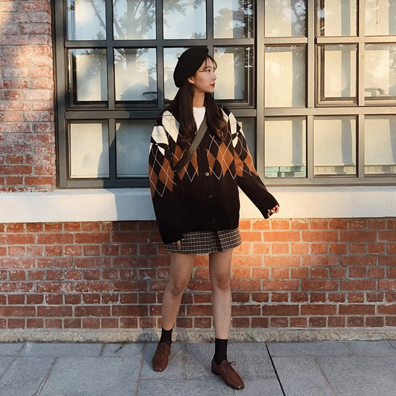 Новинка, женские свитера оверсайз, Осень-зима, Модные Винтажные клетчатые кардиганы с v-образным вырезом, однобортный Свободный кардиган с пышными рукавами