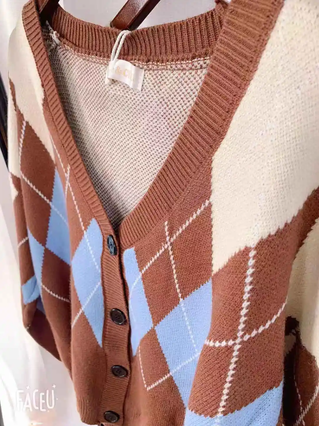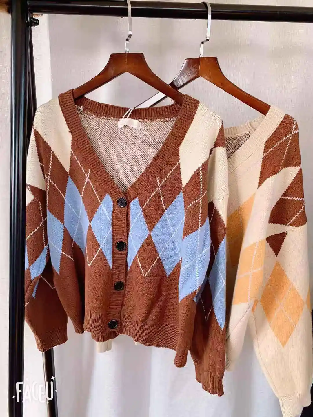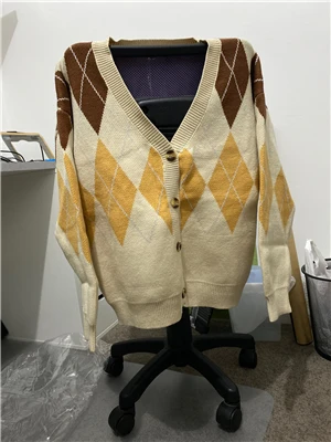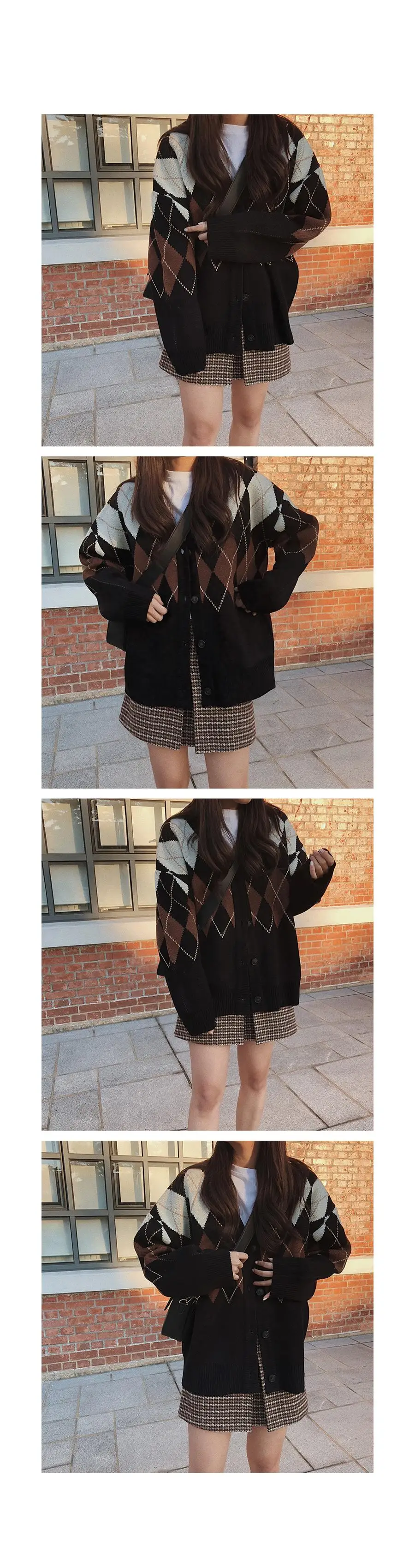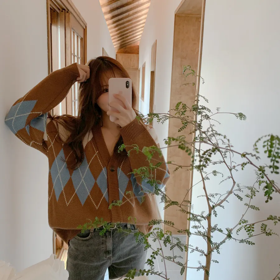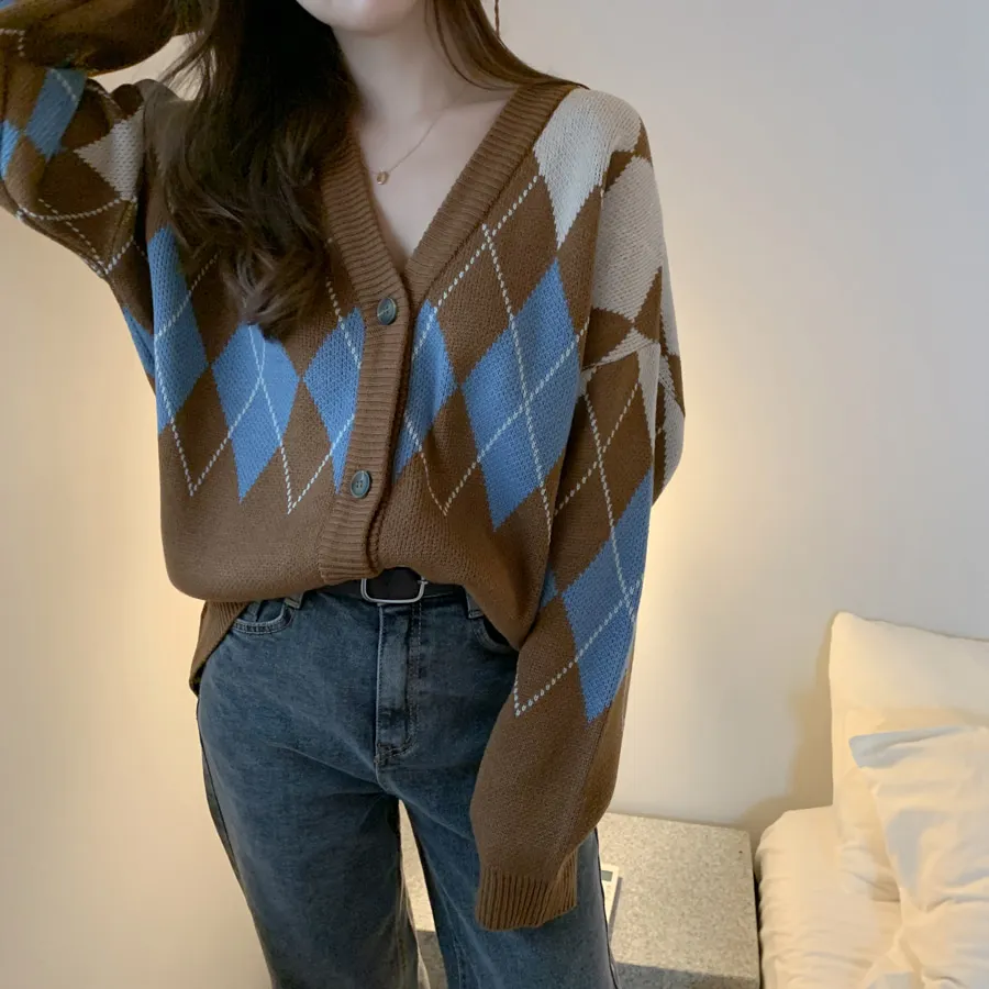 Новинка, женские свитера оверсайз, Осень-зима, Модные Винтажные клетчатые кардиганы с v-образным вырезом, однобортный Свободный кардиган с пышными рукавами