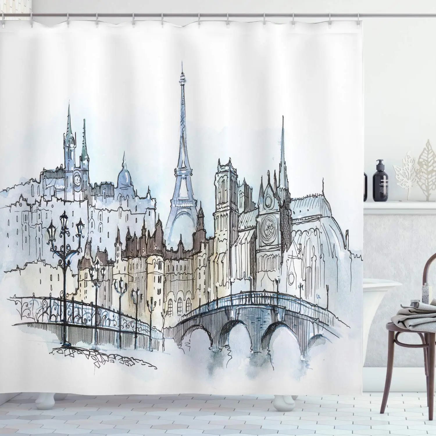 Городской декора душ Шторы Городской Пейзаж Париж Эйфелева башня иллюстрации старых зданий узор ткани Ванная комната Декор для ванной комнаты, крючки, станок и 70 в