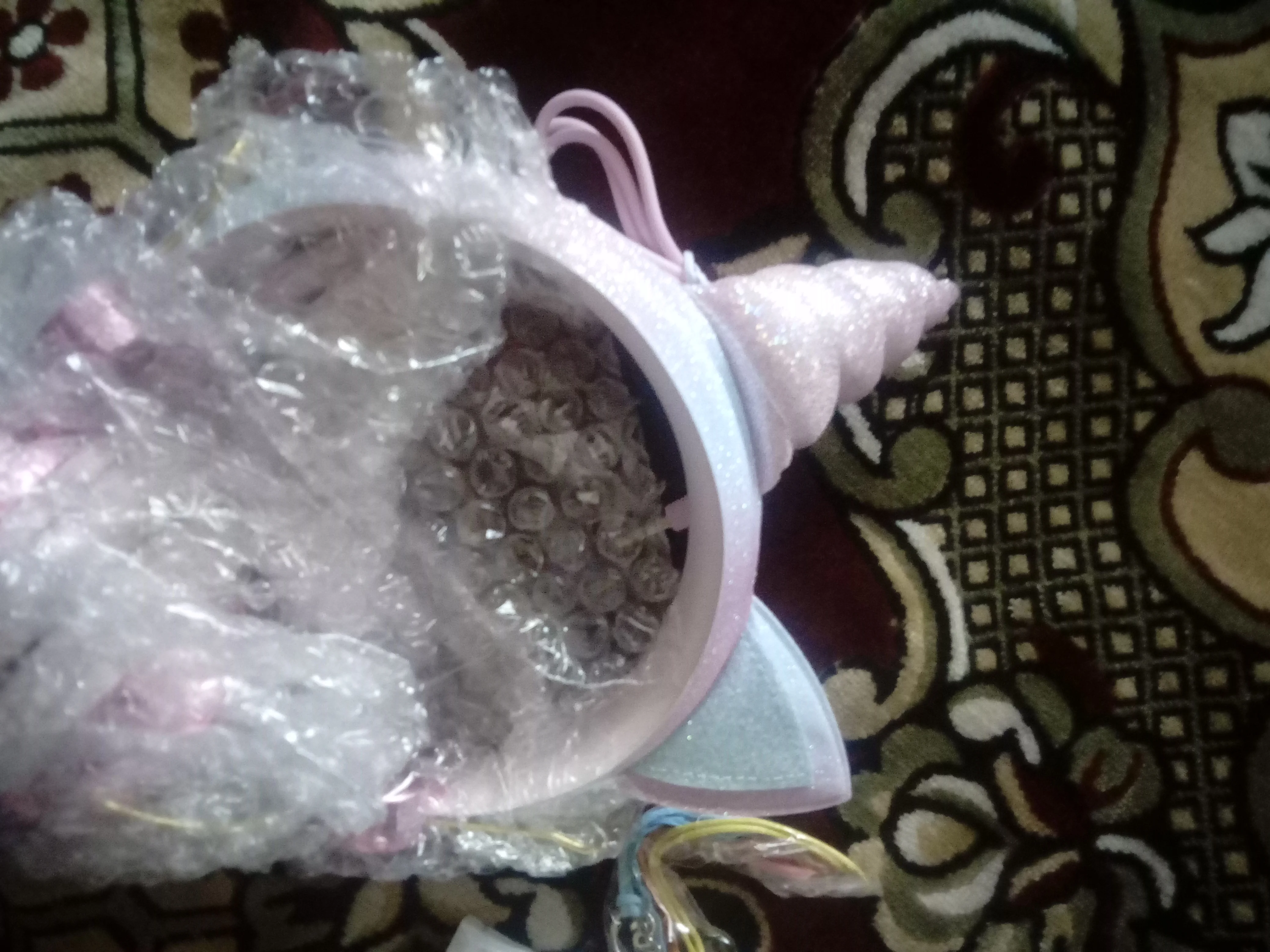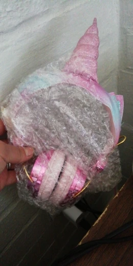 Наушники пришли быстро, за 2 недели до СПб. Ожидала, что они будут в коробке.( Но упакованы были хорошо, только ушки и рог немного примяты. Работают, звук хороший, выглядят прикольно!) В подарок продавец положил браслет.