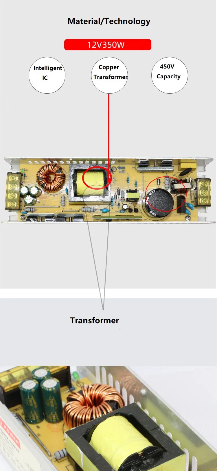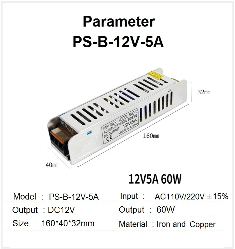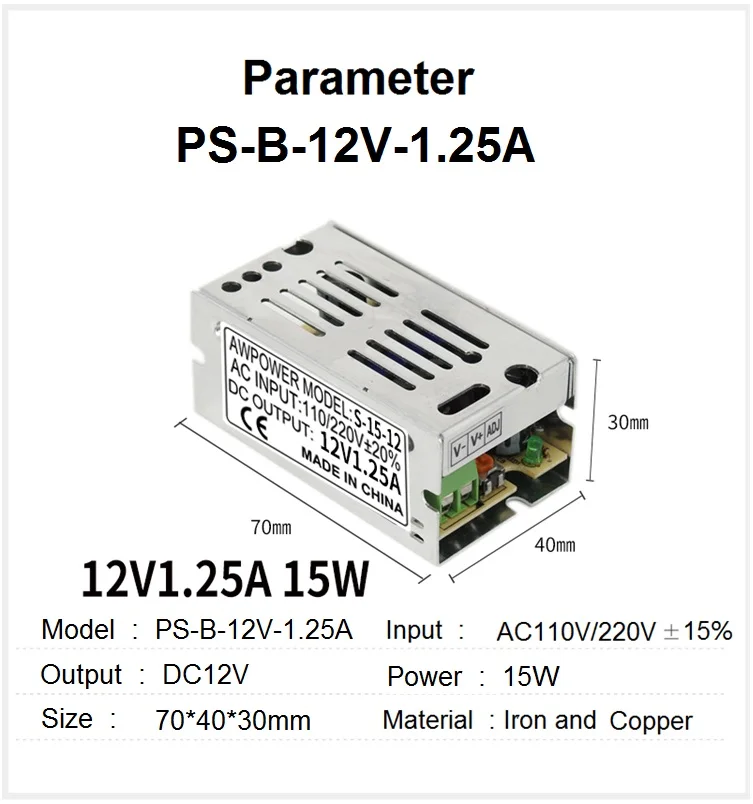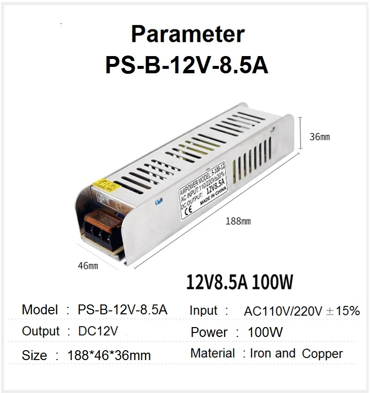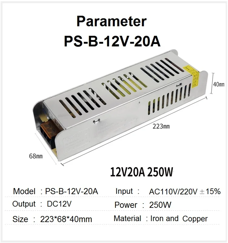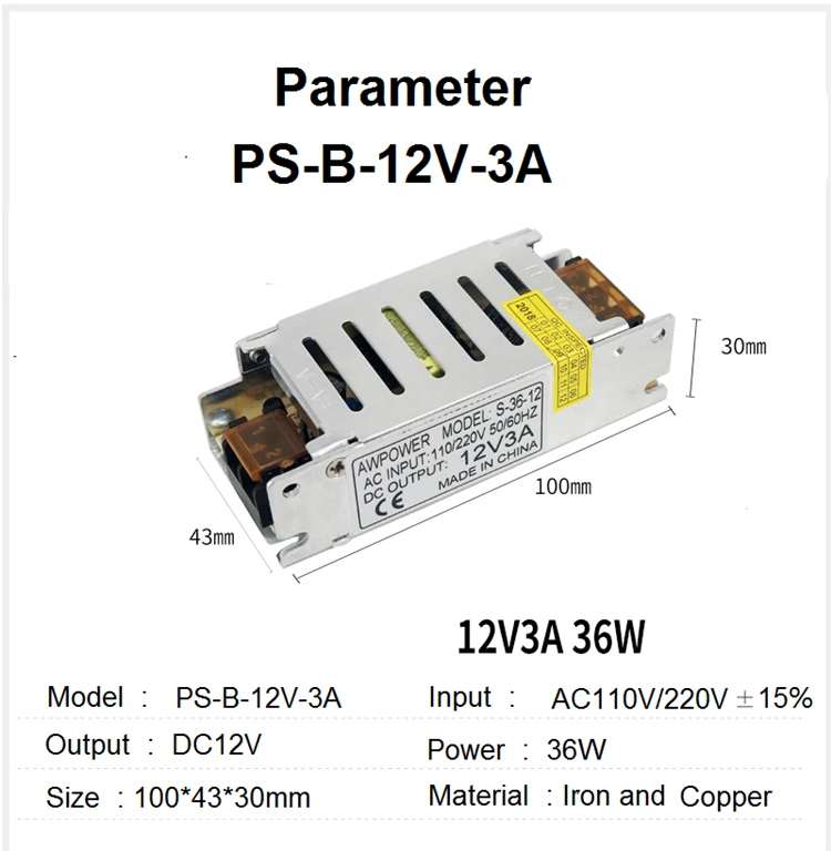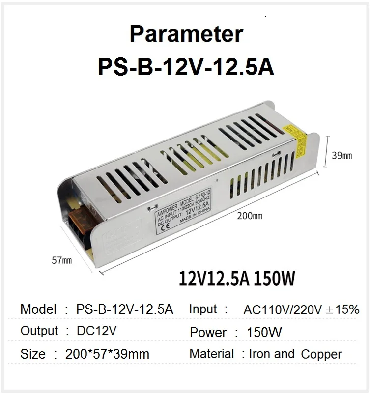 Светодиодный импульсный источник питания Вход 110V/220Vac Выход 12VDC Ток 1.25A/3A/5A/8.5A/10A/12.5A/16.5A/ 20A/ 25A/30A Мощность 15/36/60/100/120/150/200/250/ 300/360W Шнур питания не входит в комплект по умолчанию Если вам нужен шнур питания, необходимо купить его у опции EU/AU/US/UK Шнур питания 1,5 метров в длину, 3*0.75m2 кабель