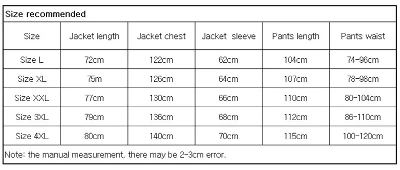 Эта одежда стандартного размера. Пожалуйста, не выбирайте слишком большой размер. Например, рост 172 см, вес 72 кг, вы можете выбрать размер L. Обратите внимание: размер L = размер 46, размер XL = размер 48, Размер 2XL = размер 50, Размер 3XL = размер 52