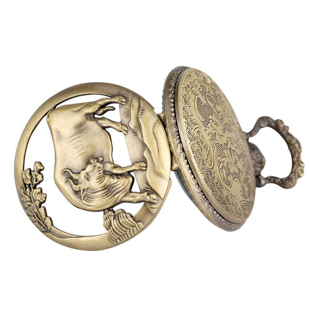 Бронзовый Китайский Зодиак корова кварцевые карманные часы половина охотника старомодное ожерелье брелок антикварная коллекция часы унисекс