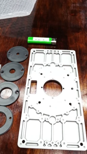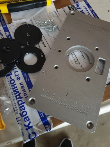 Хорошая, массивная пластина для фрезерного стола. Родные отверстия для крепления фрезера не знаю от какой модели, но на обратной стороне есть отметки, где надо засверливаться для большинства стандартных фрезеров. Для моей Makita RT0700 есть отметки под оба типа подошв, и стандартную погружную, и кромочную(ответил на фото). В итоге после небольшой доработки получается хорошая добротная площадка. Доставка нормальная - около 3 недель в карантин, но довольно долго тупила местная почта.