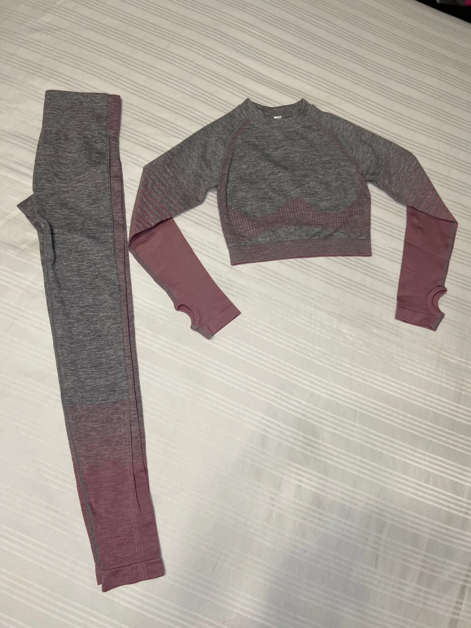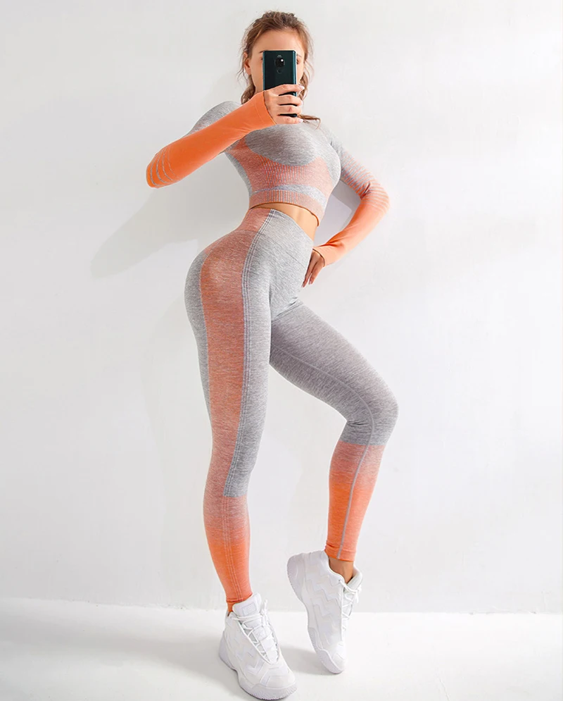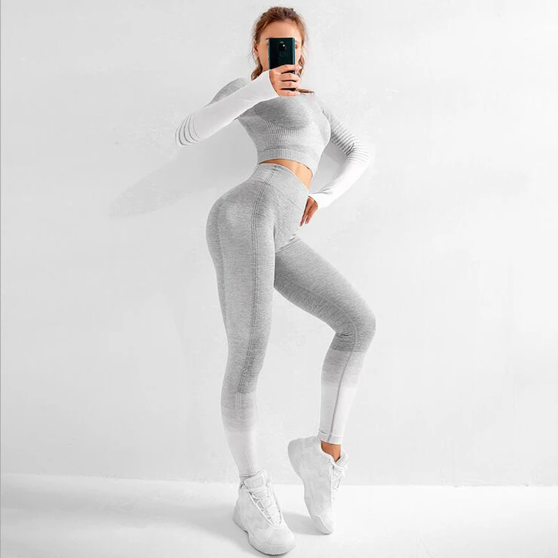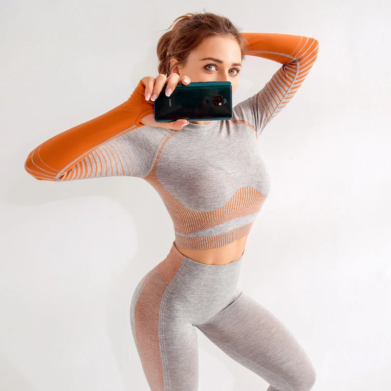 Комплект спортивный женский для фитнеса, укороченный топ с длинным рукавом, бесшовные леггинсы с резинкой для ягодиц, спортивные костюмы для йоги, 2 предмета