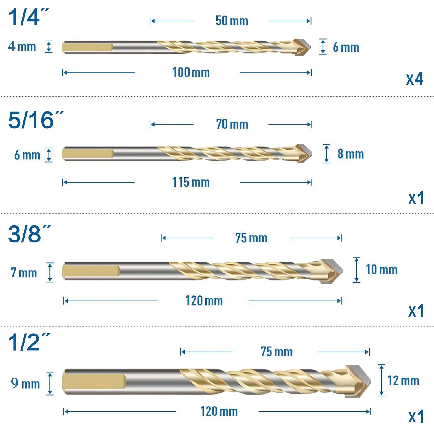 Количество посылка: 5 шт., 2x6 мм (1/4 "), 1x8 мм (5/16"), 1x10 мм (3/8 "), 1x12 мм (1/2")