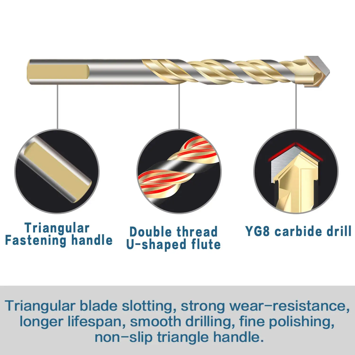 Двойной U типа слот дизайн с быстрого сверления удаления пыли, 3-туфли без каблуков для конических фрез позволяет сверло для того, чтобы быть проведены плотно и стабильно в сверлильные машины. При сверлении твердого материала (стекло, фарфоровая напольная плитка, мрамор или гранит), пожалуйста, используйте воду для смазки
