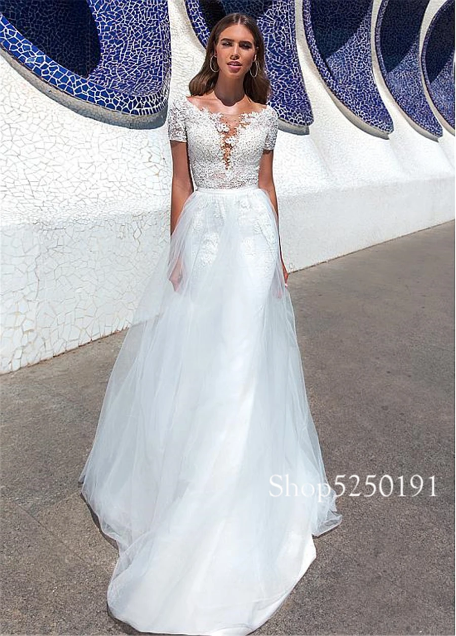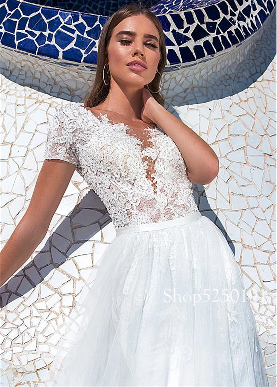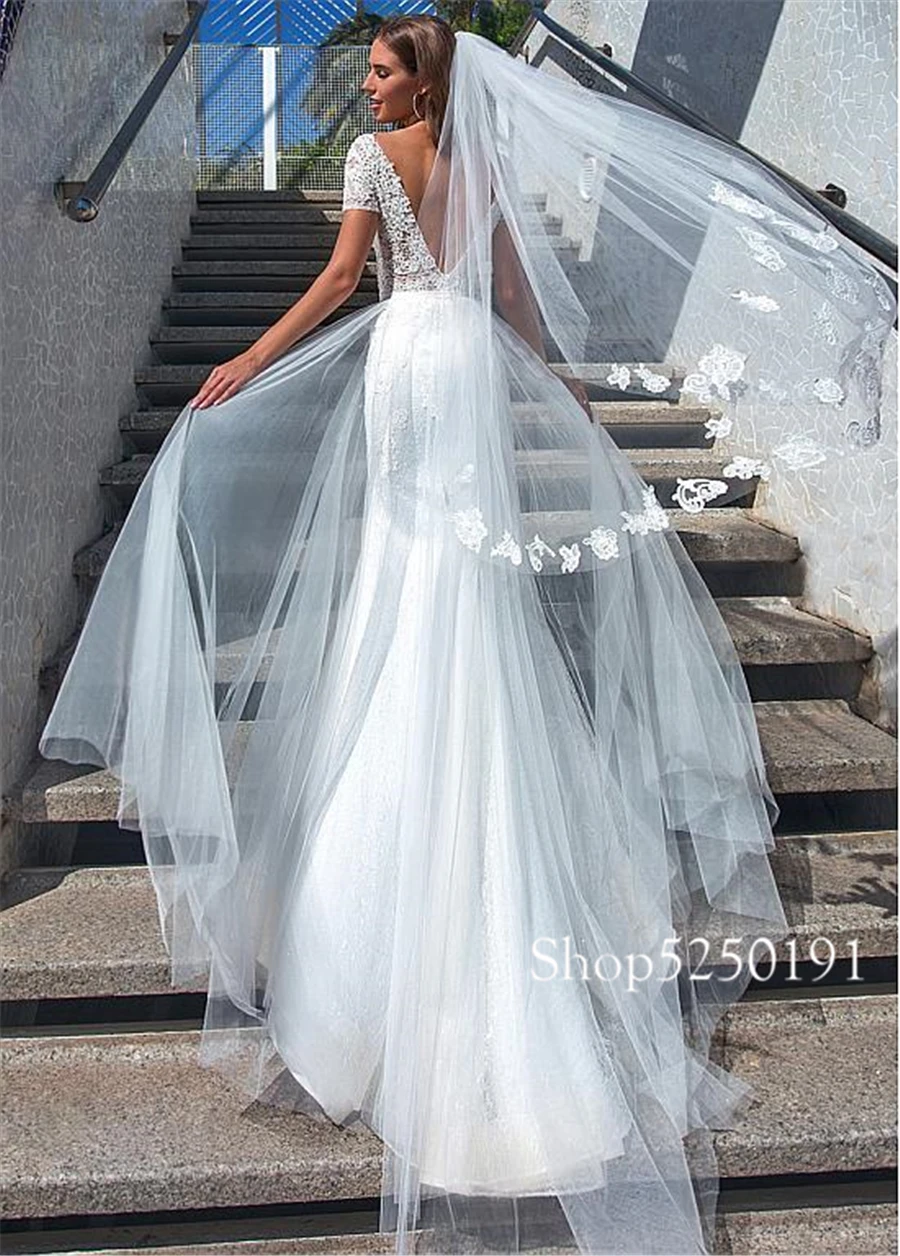 Потрясающее Тюлевое кружевное свадебное платье 2 в 1 с глубоким вырезом и съемной юбкой с короткими рукавами, модное свадебное платье с кристаллами