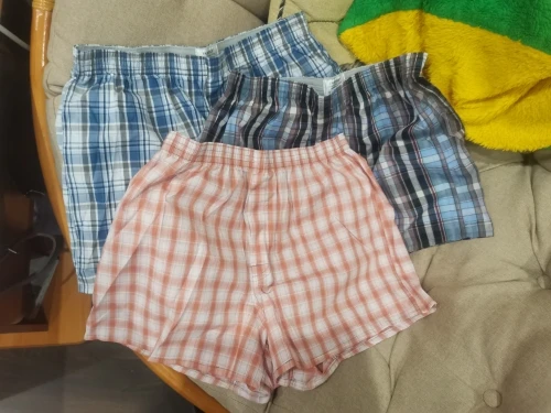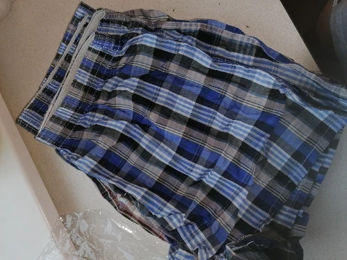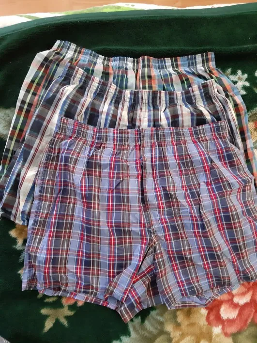 Оформление в конце октября 2 дня, доставка AEStShiping посредством DPD в объединенных пакетах с другими заказами до Новосибирска 19 дней. Заказ пришел в черном полиэтиленовом почтовом пакете с разрезом 10см. Продукт без какой либо защиты и упаковки. Продукт соответствует описанию по размеру цвету форме материалу. Хлопок плотный и жёсткий на ощупь как ситец грубого помола, видимо все же какие-то синтетические волокна в материале есть. Аллергию от трения кожи об материал вроде пока нет. Комплект из трёх штук, заказал 2 комплекта. Размер 4XL: обхват талии 80-82см растягивается до 110-116см, длина 38-39см, обхват ноги до 66-68см. Использую как шорты для дома, пока удобно. Цвета обычные в клеточку.