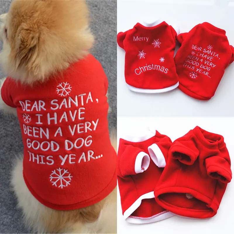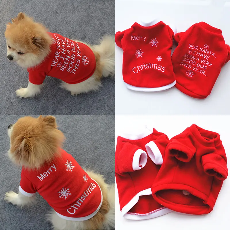 Милые рождественские костюмы для домашних животных; Зимняя футболка с вышивкой; Красная одежда для собак; Свитер с капюшоном; Верхняя одежда