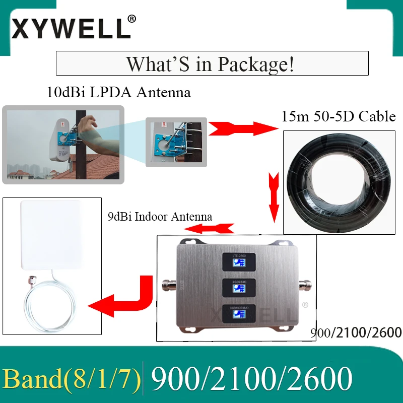 Идеально подходит для 1 - 2 комнат или небольших офисов: Попрощайтесь с удаленными звонками в вашем доме. 1. Работа для 900/2100/2600MHz повторитель усилитель сигнала. 2. Диапазон частот (GSM900): UL:890 ~ 915 МГц; DL:935 ~ 960 МГц; Диапазон частот (WCDMA2100): UL:1920 ~ 1980 МГц; DL:2110 ~ 2170 МГц; Частотный диапазон (LTE2600): UL:2500 ~ 2570 МГц; DL:2620 ~ 2690 МГц; 3. С ЖК-дисплеем, может указывать состояние сигнала. 4. Площадь покрытия: около 500 кв. М без покрытия 1. Крышка антенны около 100-150кв. М. 5. Высокая линейная конструкция, ALC технология. 6,1 набор с 2G 3G 4G Наружной антенной, 2G 3G 4G внутренней антенной, Репитер сигнала. Идеально подходит для домашнего использования. 7. Улучшите внутренний мобильный сигнал, больше не снижайте звонки, больше нет плохой скорости сети.