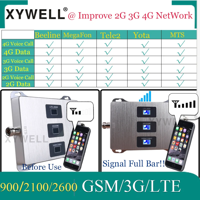 Этот усилитель подходит для GSM 900mhz 3G2100mhz LTE2600mhz частотного диапазона. Он может увеличить 2G 3G голосовые данные 4G. Если ваш сигнал 4G LTE2600(FDD Band 7), этот повторитель также может увеличить данные 4g для вас. Пожалуйста, убедитесь, что вы можете получить по крайней мере 2 бара 900 МГц (полоса 8)2100 МГц (полоса 1)LTE2600(FDD полоса 7) сигнал на открытом воздухе перед покупкой, В противном случае этот продукт не может вам помочь. Для улучшения сигнала в помещении необходим хороший внешний сигнал.