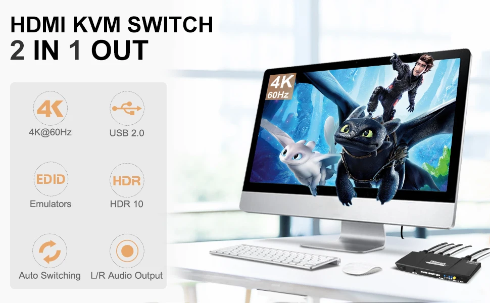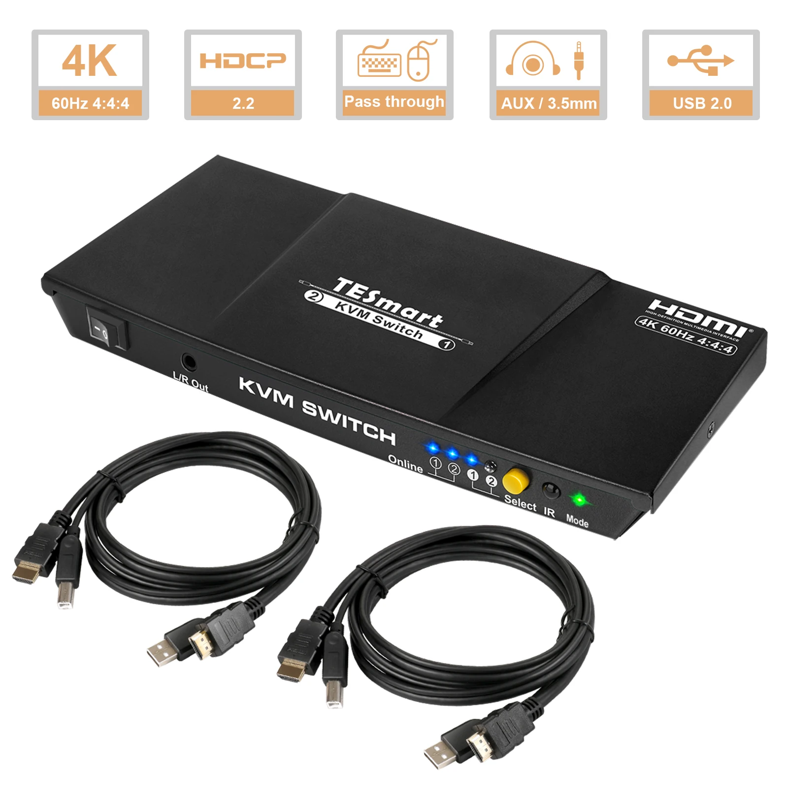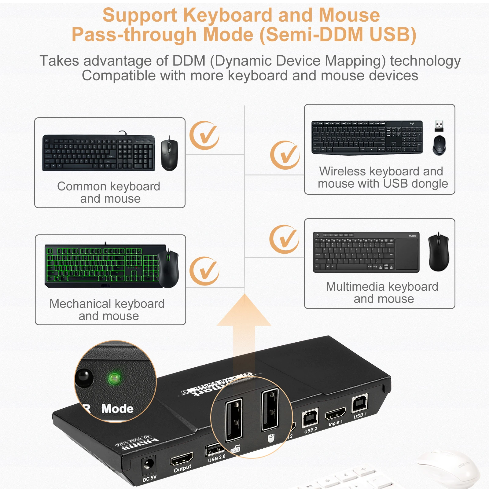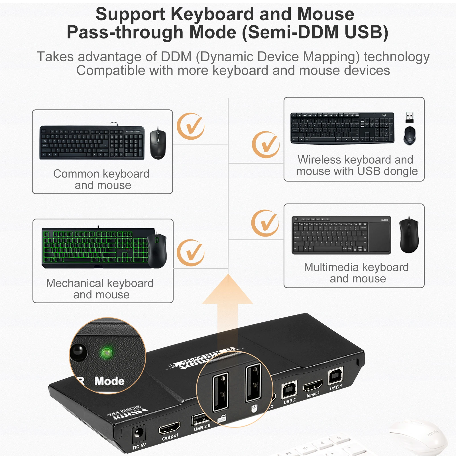 KVM-переключатель 4K HDMI, 2 порта HDMI, 2x1KVM-переключатель, 2 в 1, выход, поддержка USB, 2.0 портов, клавиатура и мышь