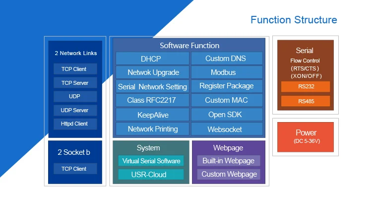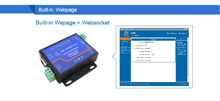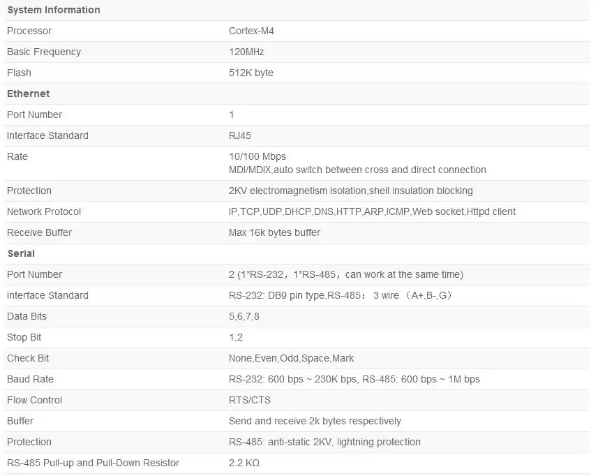 Введение сервера серийного устройстваЭто серийные RS485 и RS232 для Ethernet-сервера, используемые для передачи данных прозрачной. Usr-Tcp232-410S-это двойной последовательный сервер, который поддерживает одновременную работу RS232 и RS485. Он основан на решении Cortex-M4, а внутренний последовательный сервер интегрирует стек протоколов Tcp / IP. Кроме того, Usr-Tcp232-410S имеет функцию конечного источника питания.ОсобенностиНесколько световых индикаторов для удобной отладкиТерминал питания для промышленного примененияЯдро Arm и стек протокола Tcp / IpAuto-Mdi / Mdix, порт Rj45 с 100 Мбит/сСервер Tcp, Клиент Tcp, Udp, сервер Udp и режим работы клиента HttpdДва порта могут работать независимо одновременноВиртуальный последовательный порт Sup и соответствующее программное обеспечение Usr-VcomСкорость последовательной передачи от 230 бит/с до. 4K Bps; Проверьте Бит нет, нечетный, четный, отметка и пробелПоддержка Dns и DhcpПредоставьте Пример программирования сокетов Tcp / Ip для ПК, Vb, C ++, Delphi, Android, IosВстроенная веб-страница; Также можно настроить веб-страницу для пользователейКнопка перезагрузки, одна кнопка для восстановления настроек по умолчаниюRj45 со светильник вым индикатором связи/передачи данных, встроенным изолирующим трансформатором и электромагнитной изоляцией 2 кВГлобальный Уникальный Mac-адрес, купленный в Ieee, пользователь может определить Mac-адресПоддержка обновления прошивки Ort через сетьПоддерживает выживание, быстрое обнаружение мертвых звеньевУчетная запись поддержки и пароль, может использоваться для входа на страницу и настроек сетиПоддержка одноканального веб-розетки, реализация двунаправленной прозрачной передачи, Заводская веб-страница и серийный номер 0Поддержка Modbus Rtu для Modbus TcpПоддержка функции вещания Udp, отправка и получение данных со всех Ip в сетиЧто в упаковке:1 сервер с двумя последовательными устройствами, 1 блок питания 5 в 1 А, 1 серийный кабель «Мама-мама»-«Мама».