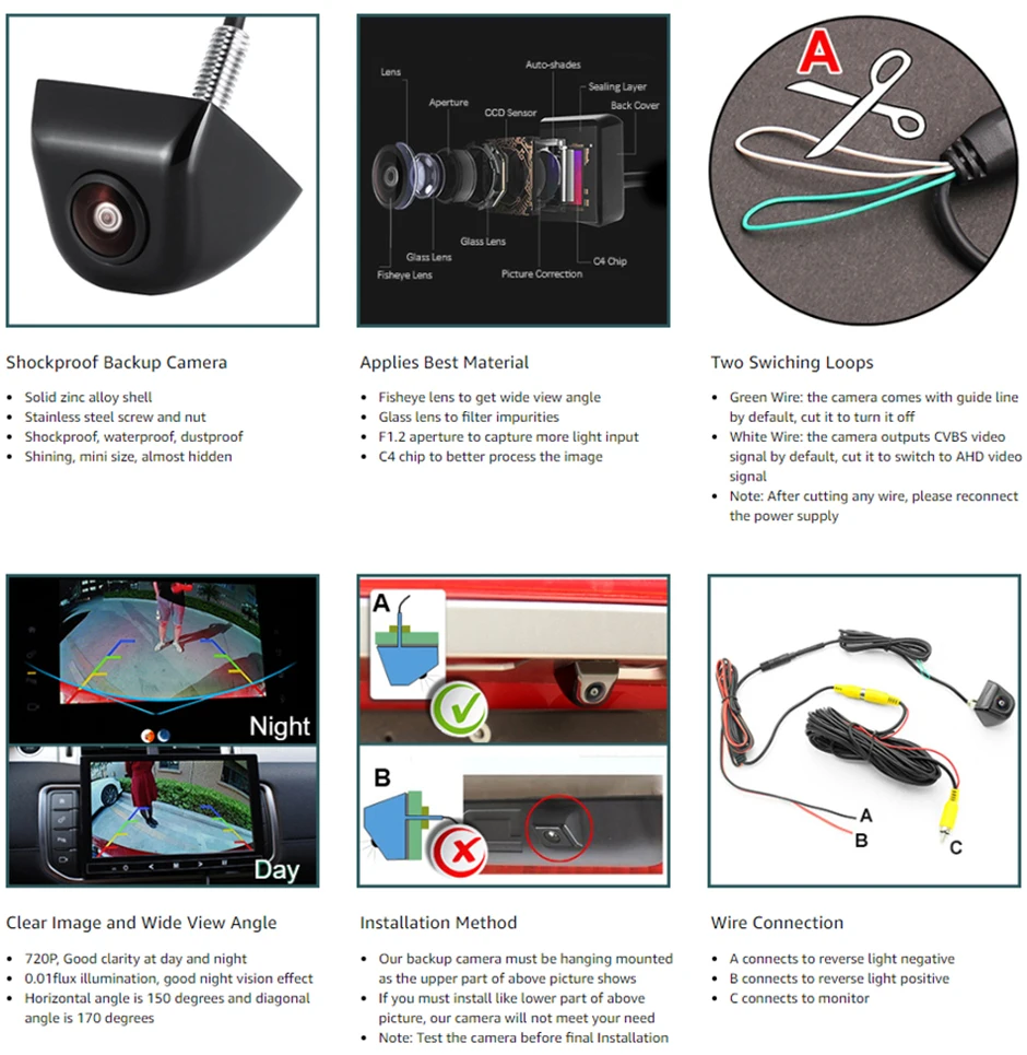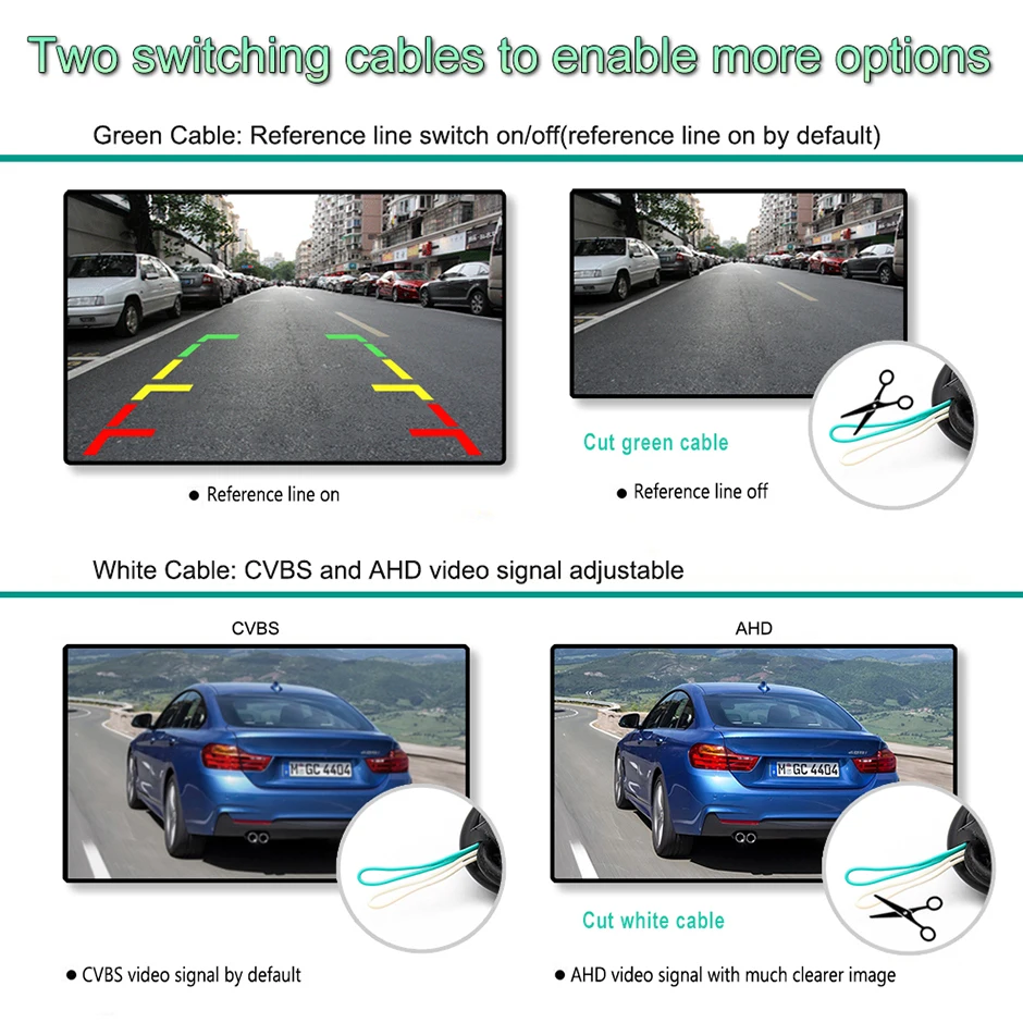 * Универсальное автомобильное Резервное копирование 720 * CAMERA---1280 разрешение, высокая четкость, угол обзора 720 градусов, не беспокойтесь о зоне слепых зон, водонепроницаемость IP68, правильно работает при мойке автомобиля или плохой погоде, фантастический эффект ночного видения.* Поддержка видеосигнала AHD и CVBS --- эта Автомобильная камера заднего вида может работать как с AHD-мониторами, так и с CVBS-мониторами. Его Выходной видеосигнал по умолчанию является CVBS, если вам нужно, чтобы он подключился к монитору AHD, отрежьте белый кабель на камере и Подключитесь к источнику питания. Изображение видеосигнала AHD намного чётче, чем CVBS.* Направляющая линия включения или выключения регулируется --- на этой камере заднего вида есть небольшая зеленая петля переключения. Когда вы получаете его, он по умолчанию имеет направляющую линию. Если вам не нужна направляющая, отрежьте зеленый контур и подключите его к источнику питания.* Мини-корпус из цинкового сплава --- камера заднего вида очень маленькая, корпус изготовлен из высококачественного цинкового сплава, блестящий, ударопрочный и нержавеющий. Способ установки должен быть подвешен, как показано на рисунке, иначе изображение будет необычным.* Внимание --- согласно нашему опыту, некоторые дешевые Головные устройства Android имеют настройки для видеосигнала AHD, но правда в том, что они не могут отображать изображение AHD, потому что они совсем не поддерживают AHD. Если да, то Вы можете применять только видеосигнал CVBS, надеемся на понимание.