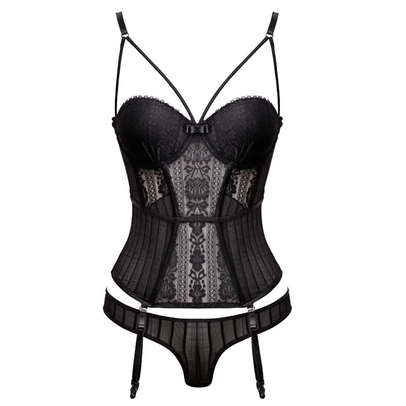 Кружевное Бюстье с высокой аналогичностью + трусики-танга с чашкой, облегающий корсет с рыбьими косточками, набор ремней, пояс, женское нижнее белье, черный корсет