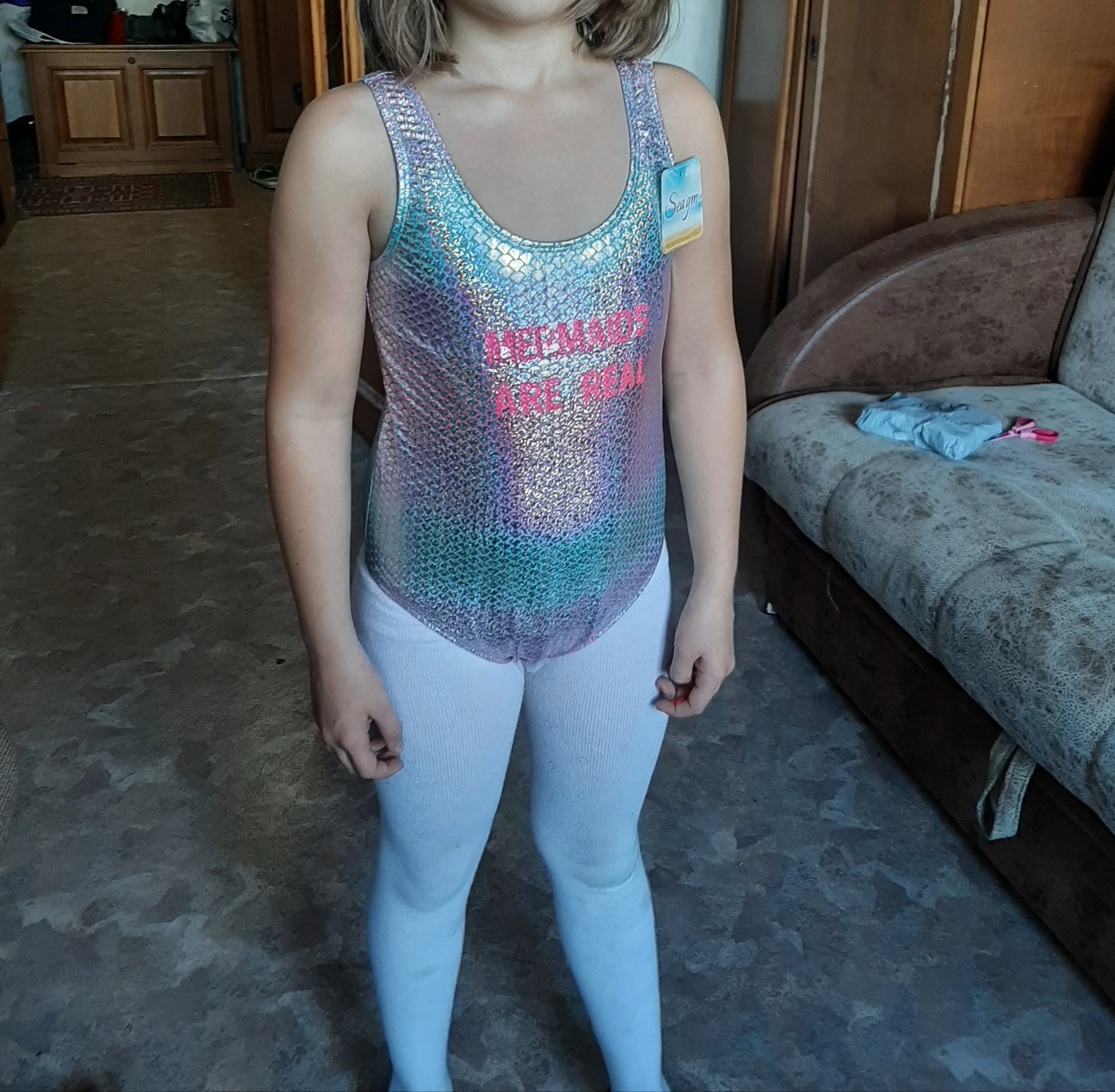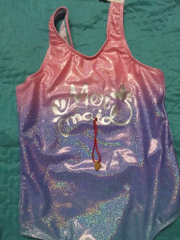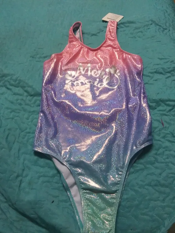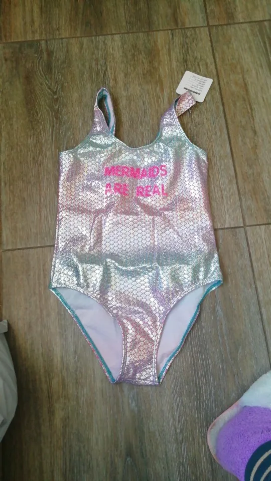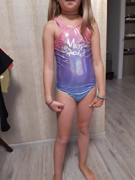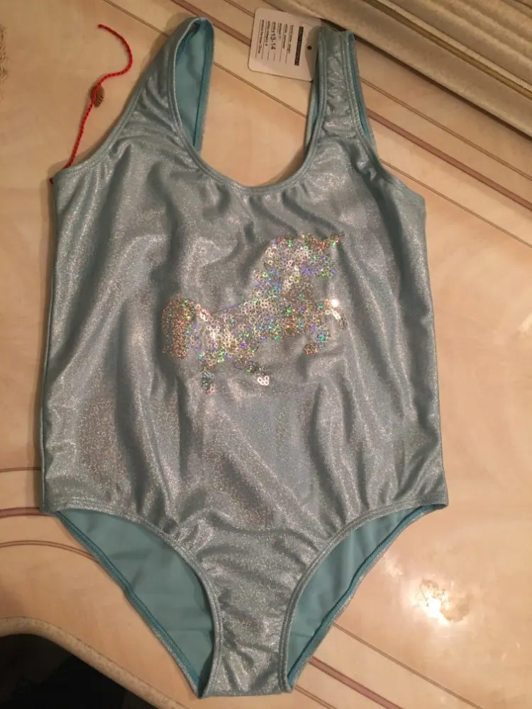 Красивый купальный костюм с блестящими блестками. Отличное качество. Спереди подкладка, купальный костюм не просвечивает. Настоящая ткань для купания. Купил Размер 13 для девочки 11 лет в подарок. Выглядит достаточно хорошо для 12 лет. Купальный костюм пришел в красивую органическую сумку и небольшой подарок (красный браслет). Получил в течение 1,5 недель. Настоятельно рекомендуется. 100 *