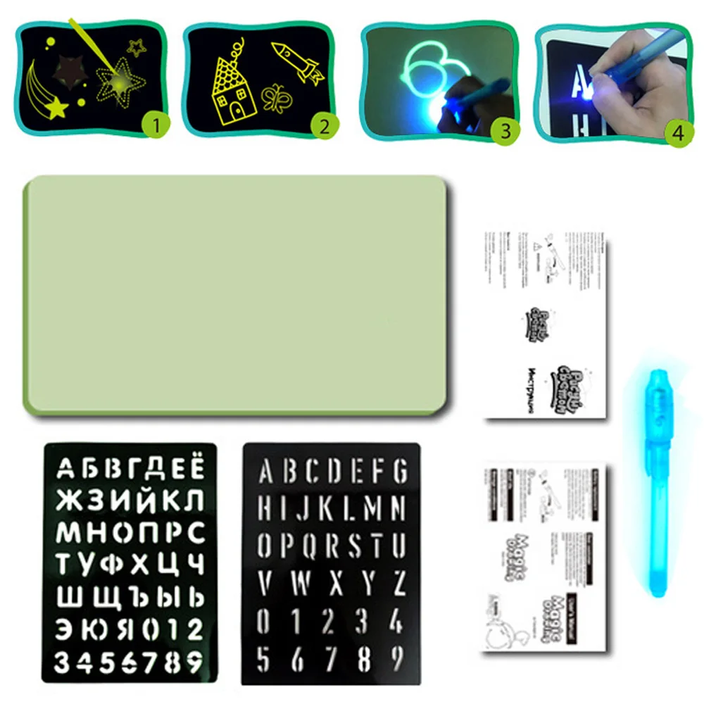 3D DIY алмазная живопись А4 светодиодный светильник для планшета Стразы для рисования вышивка крестиком зажим лоток для стежка ручка Клей Пинцет игрушкаUSD 12,77/Шт.Детский волшебный флуоресцентный замерзающий светильник доска для рисования 3D светодиодный светящийся каракули граффити Sketchpad высокий светильник er шаблон игрушки Подробности: Используйте в ночное время или в темноте, чтобы создать волшебные иллюстрации, которые светится в темноте! Ручка содержит невидимые чернила для записи сообщений, которые можно просматривать только, светя светильник на них Рисунки выцветают в течение нескольких минут, что позволяет использовать снова и снова, дети могут получить все удовольствие без беспорядка! Этот набор для рисования может исследовать творчество ребенка, развивать его Навыки письма, счета и рисования, раскрывать его творческий потенциал Используйте предоставленные трафареты, чтобы добавить Особое Прикосновение, или алфавитные трафареты, чтобы создать слова и цифры Изготовлен из нетоксичного, высококачественного материала для поддержания высочайшего стандарта безопасности здоровья, безвредный для глаз Рекомендации по использованию: 1. Чем меньше светильник в комнате, тем ярче изображение. 2. Рекомендуемое время рисования не превышает 15-20 минут. 3. Не красьте на планшете, за исключением знака фонарика. 4. Не направляйте светильник-маркер на глаза. 5. Рекомендуется положить планшет в темное место в свободное время. Спецификация: Материал: флуоресцентный экран Размер: A3: 41x28x1,5 см/16,14x11,02x0,59 дюймов A4: 29,5x21x0,8 см/11,61x8,27x0,31 дюймов A5: 20x14x0,8 см/7,87x5,51x0,31 дюймов Доступные размеры: A3, A4, A5 Доступный Стиль: русский, английский Пожалуйста, сообщите нам стиль, который вы хотите, когда вы покупаете его, иначе мы отправим его случайным образом Посылка: 1 х доска для рисования 1 x шаблон алфавита 1 хайлайтер 1 x Руководство пользователя Примечание: Дети в возрасте до 5 лет, пожалуйста, родители, чтобы сопровождать детей, чтобы играть На другом конце маркер ручка со специальными чернилами, что отображается только в соответствии с светильник вспышки светильник. Его нельзя нарисовать на планшете-Используйте для этого обычную бумагу!