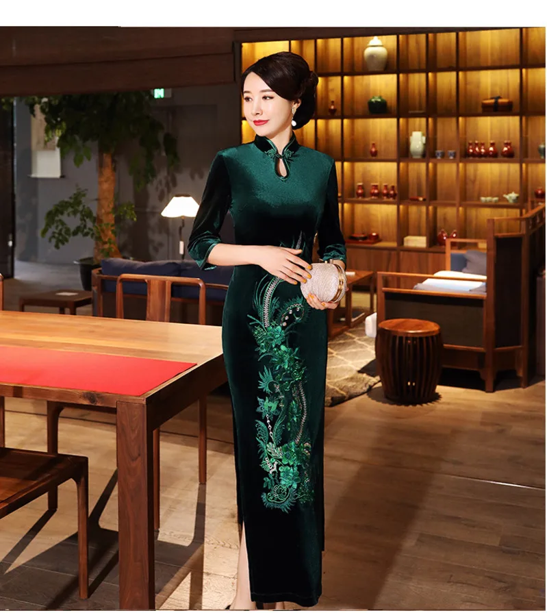 Бархатное платье Ципао Sheng Coco с вышивкой павлина, платье Ципао с длинным рукавом, женское длинное китайское платье Ципао, Шанхай