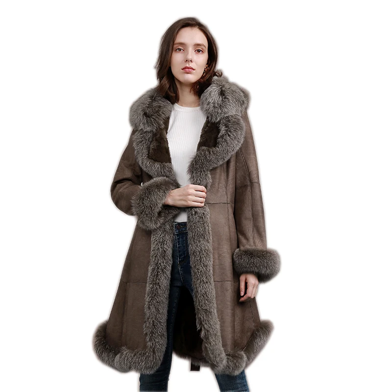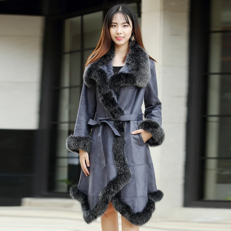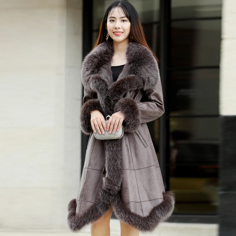 Женская кожаная куртка с подкладкой из меха кролика, длинная меховая Шуба с лисьим воротником, теплая зимняя шуба большого размера
