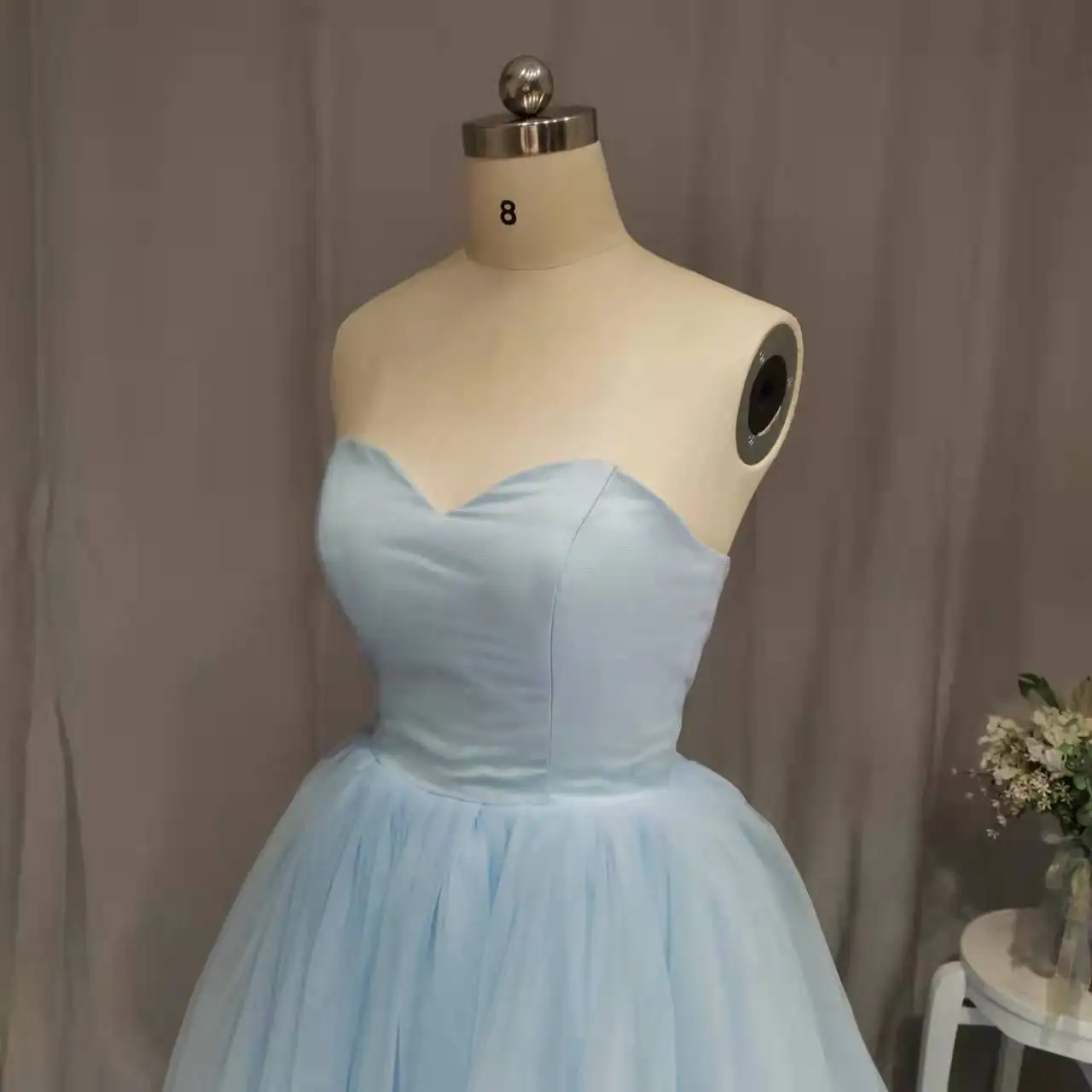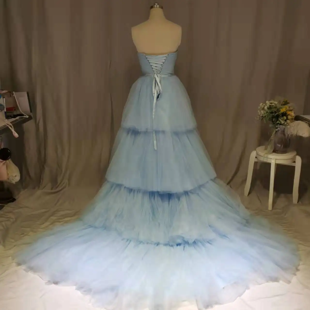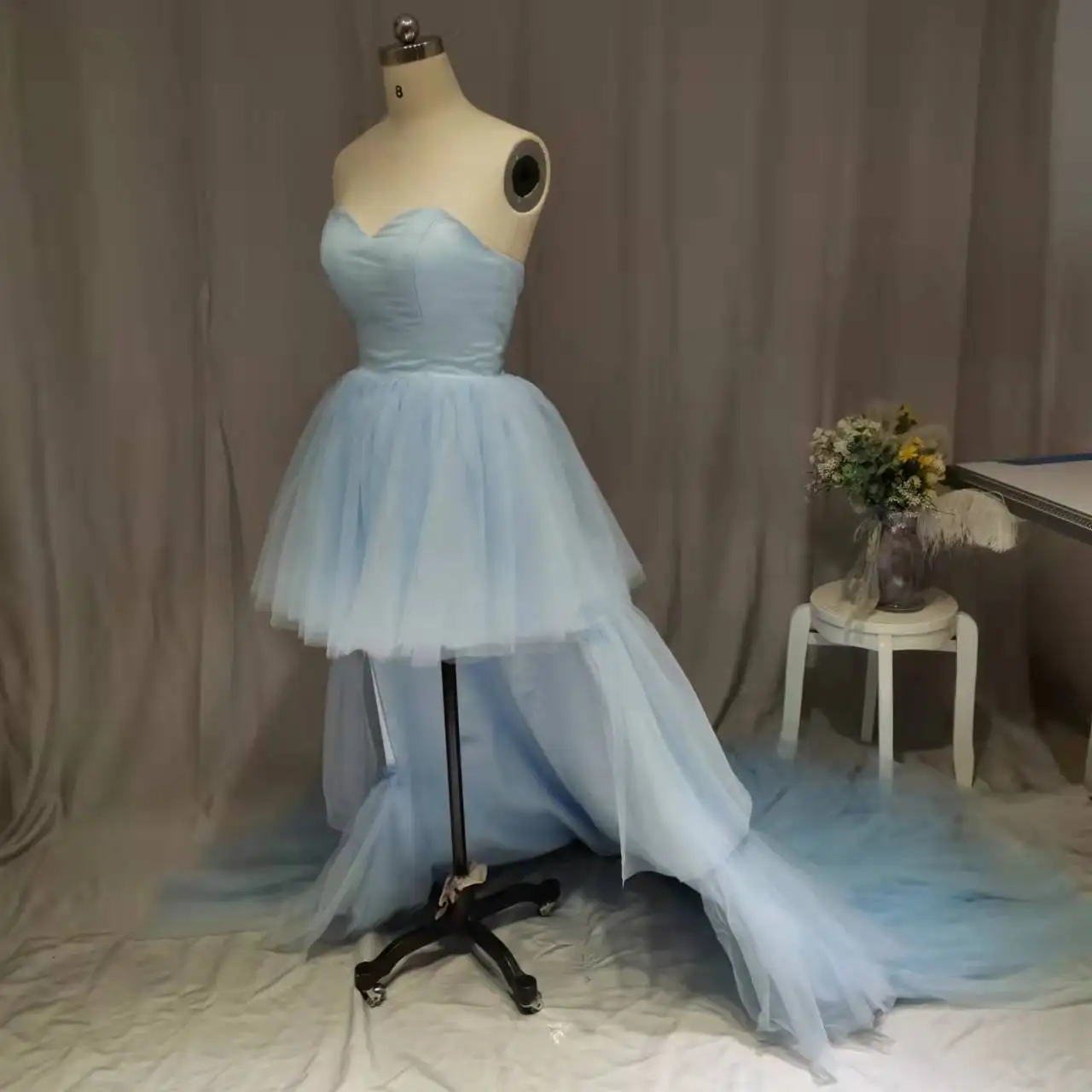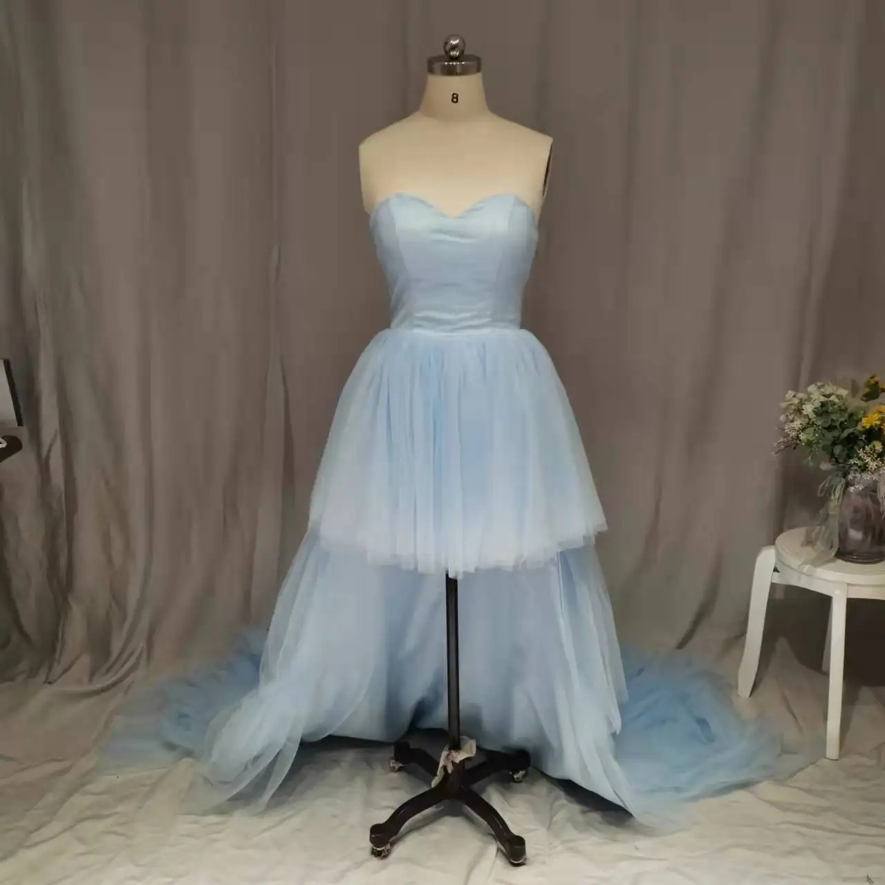 Небесно-Голубые Вечерние платья 2022 без бретелек на молнии сзади из тюля с длинным шлейфом для молодежи с высоким и низким вырезом Вечерние платья для выпускного вечера