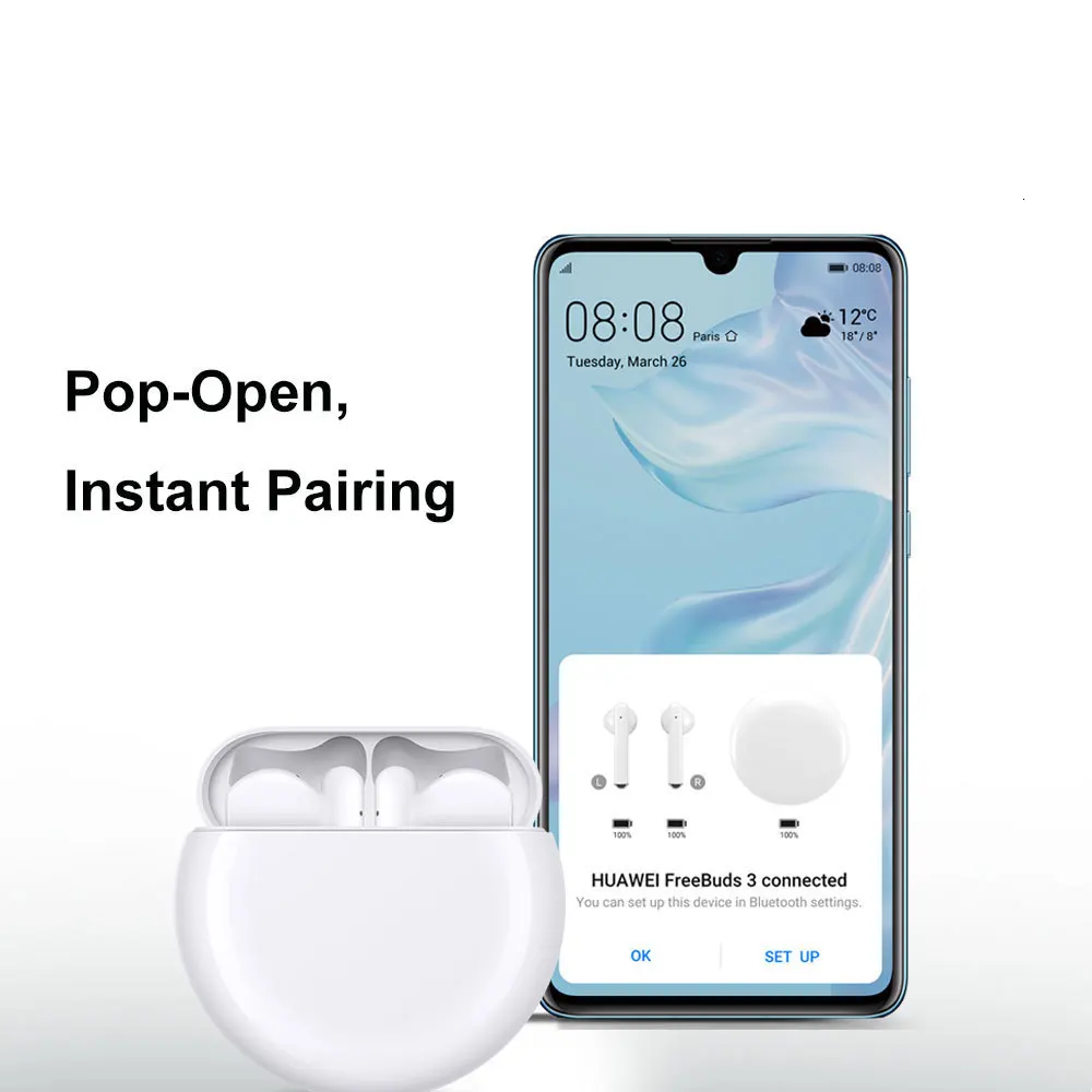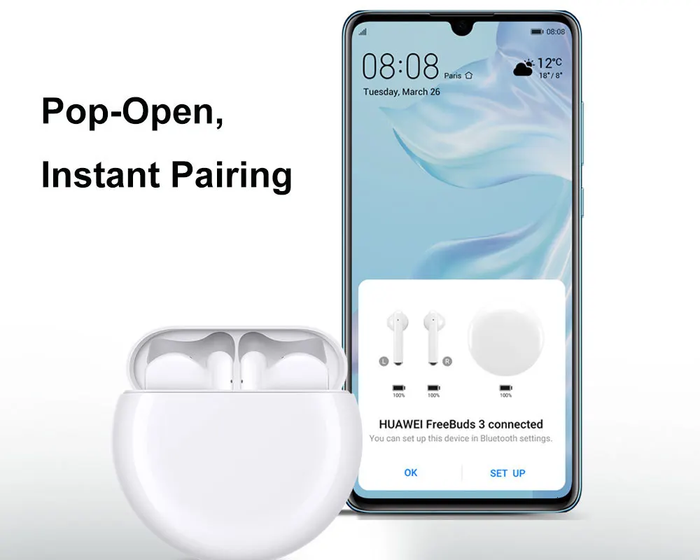 При первом соединении HUAWEI FreeBuds 3, Просто нажмите на всплывающее окно 3 для сопряжения. Последующее сопряжение происходит автоматически. Наслаждайтесь любимой музыкой мгновенно.